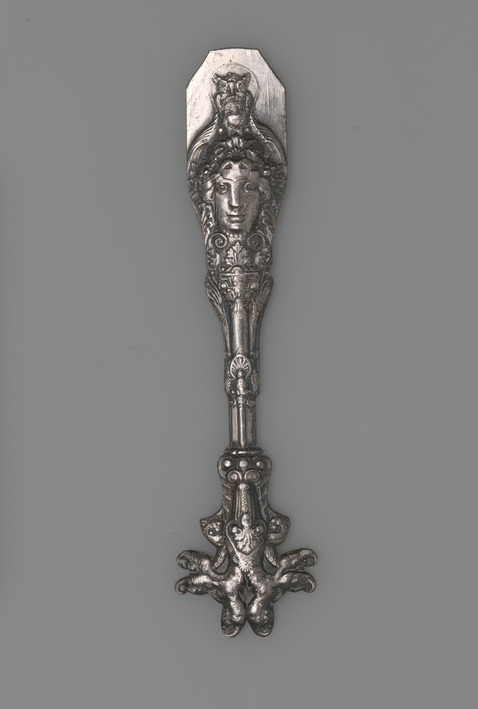 The Mythologique pattern was designed by Florentin Antoine Heller, a French silversmith trained under the influence of the École des Beaux-Arts in the studio of Jean-Léon Gérôme. Joining Gorham in 1881 after a brief stint at Tiffany & Co., Heller served as the company’s chief designer until his death in 1904, and led the company in adopting the academic style that harkened back to ancient Greek and Roman traditions. He was especially known for the precision with which he executed the steel dies that would be used for the drop presses. This talent was remarked upon with envy by several French critics and journals including La France, who lauded, “M. Heller is at once an inspired artist, having the gift of style, of grace and of elegance; and a workman possessing a skill without a rival—a hand for which no obstacle exists… . Notice how are modeled, posed, and—if I dare so to speak—harmonized … the mythological personages of these spoons, engraved in relief upon squares of steel. It is perfection.”