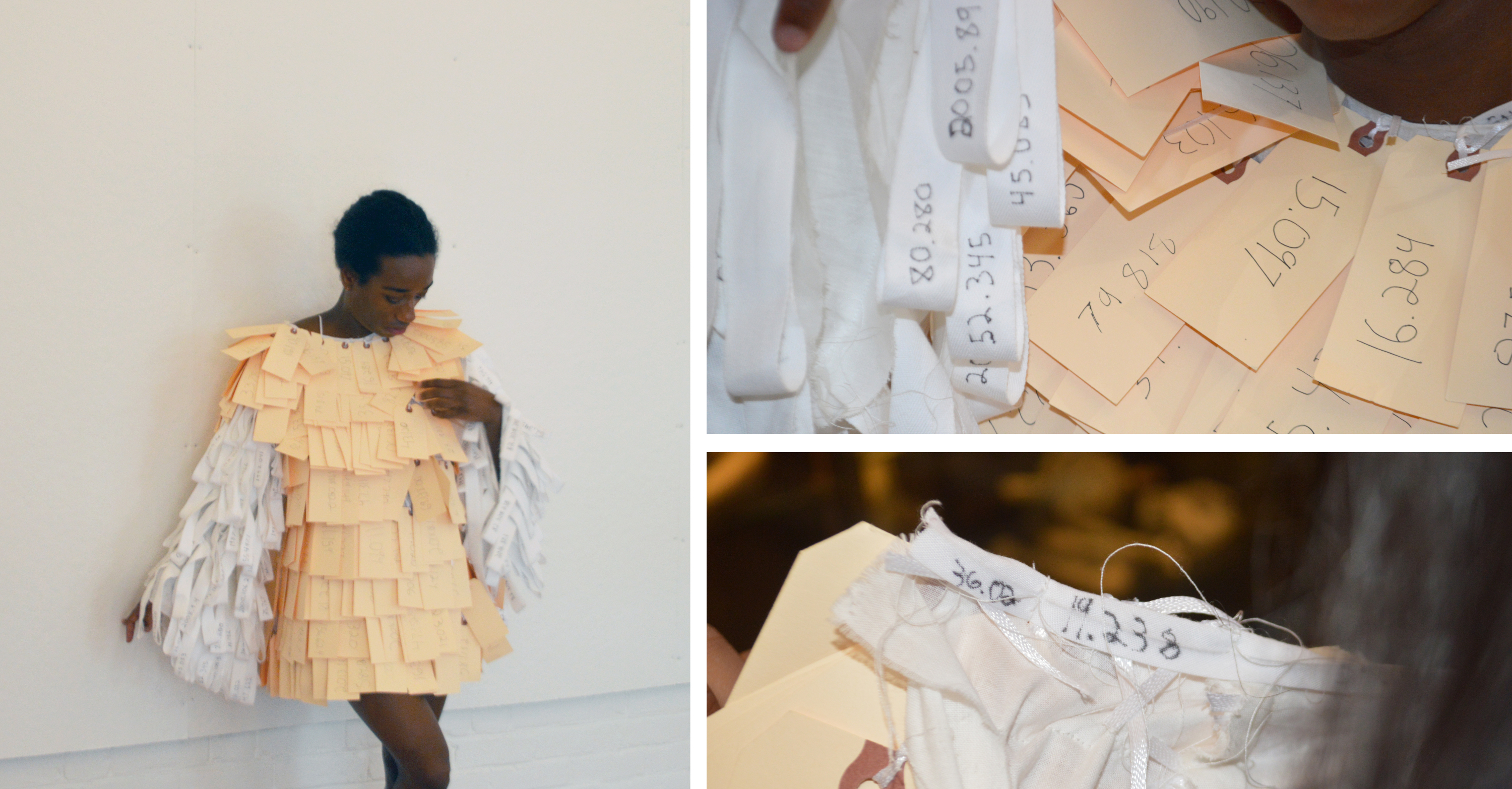 To speak to and highlight the history of the tagging that is so important to the RISD Museum’s collection, I have created a piece of clothing that is itself representative of the system. With twill tape as the sleeves and manila tags making up the body, the materials represent what is currently used and their relative location on the garments. The numbers on the tags are also accurate to real pieces in the collection. There are numbers located on the inside collar of the piece to represent the less-considered system that was replaced by the current tagging process.