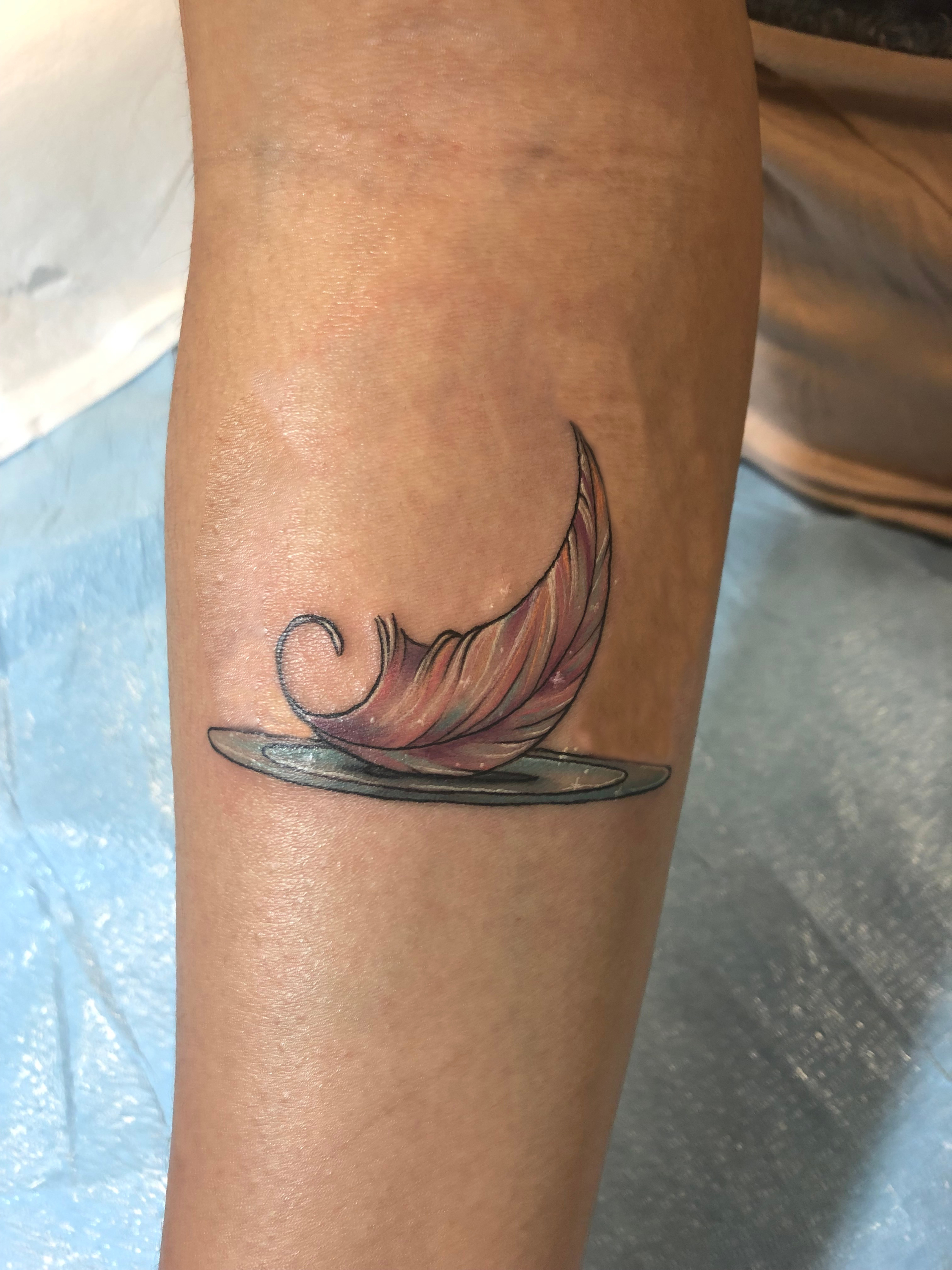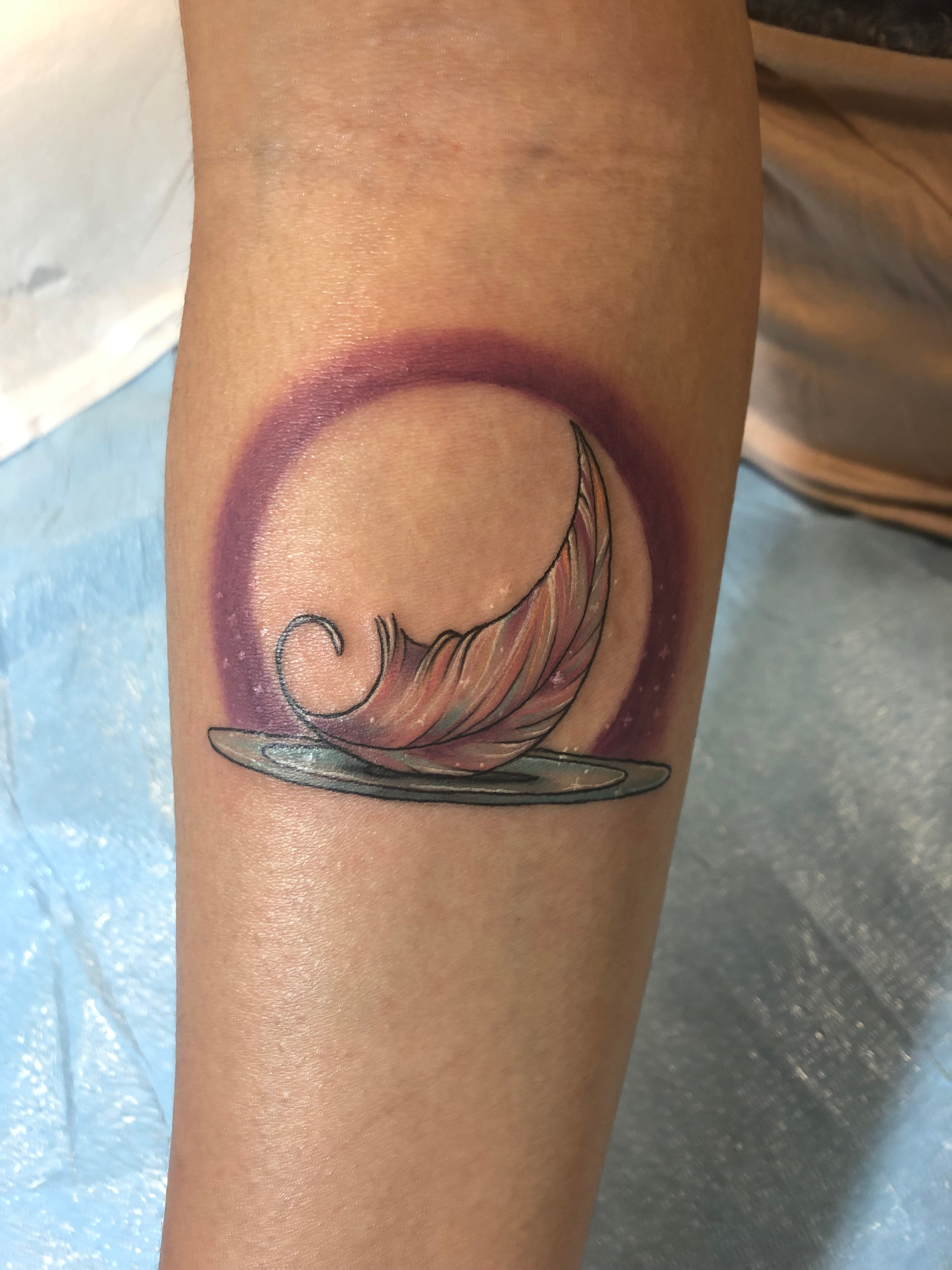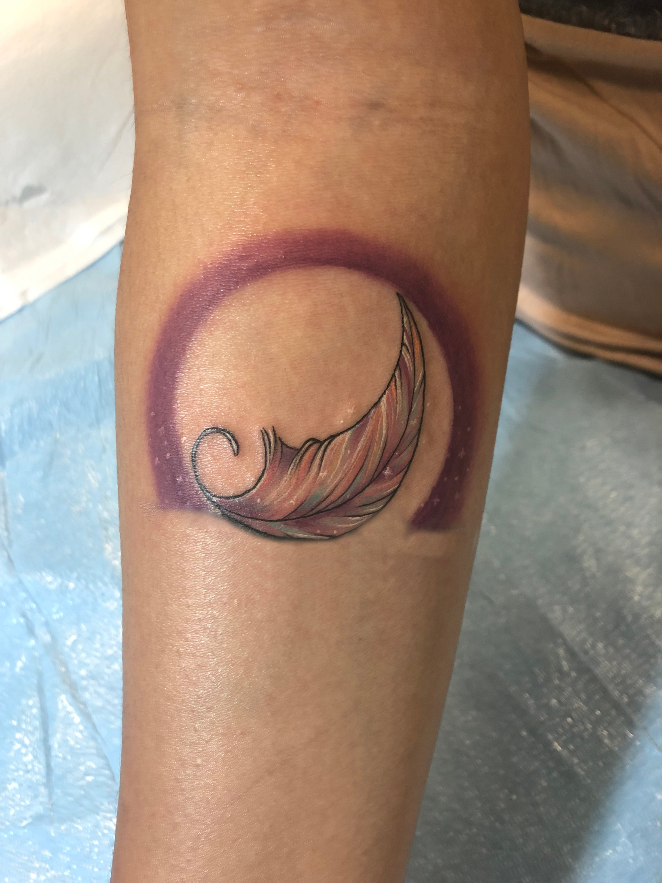 My tattoo as it looked on the day that I got it. It has three main elements: a feather, a halo, and water.