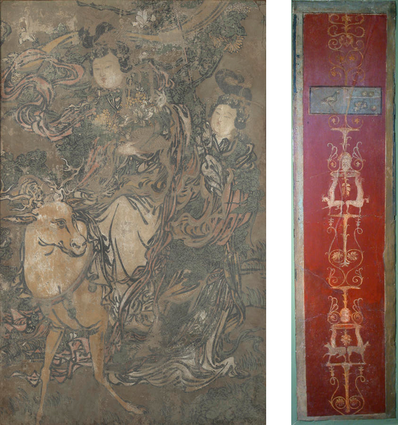 Left: Unknown (Chinese), Fragment from a Mural, 1500s-1600s. Gift of Mr. Cornelius Ruxton Love 51.559. Right: Unknown (Roman), Fragment of a wall depicting a candelabrum, 14-37 CE. Mary B. Jackson Fund 41.019