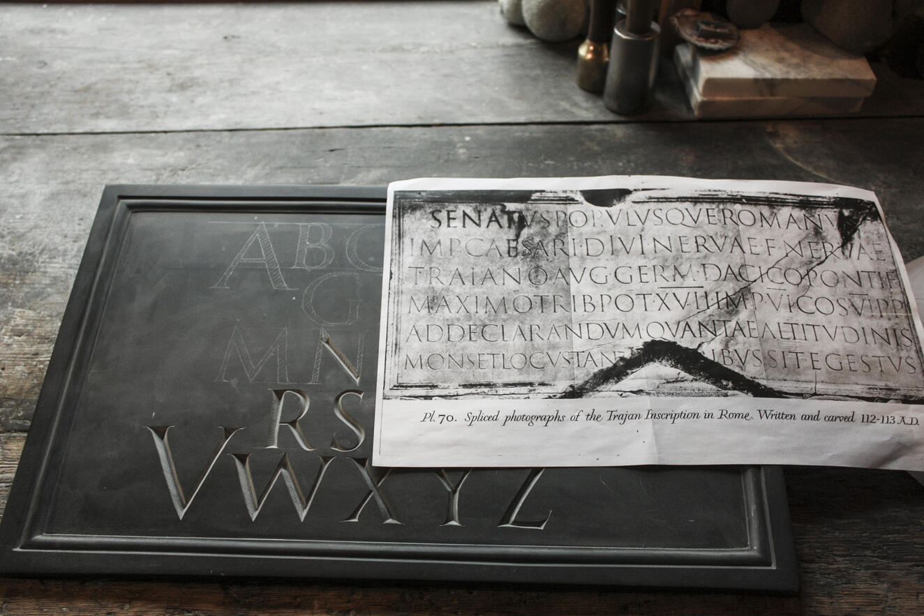 Chiseling letters has not come naturally to Mahaffey, whose background is in sculpture. She has been practicing her lettering by copying ancient Roman type on this piece of slate.