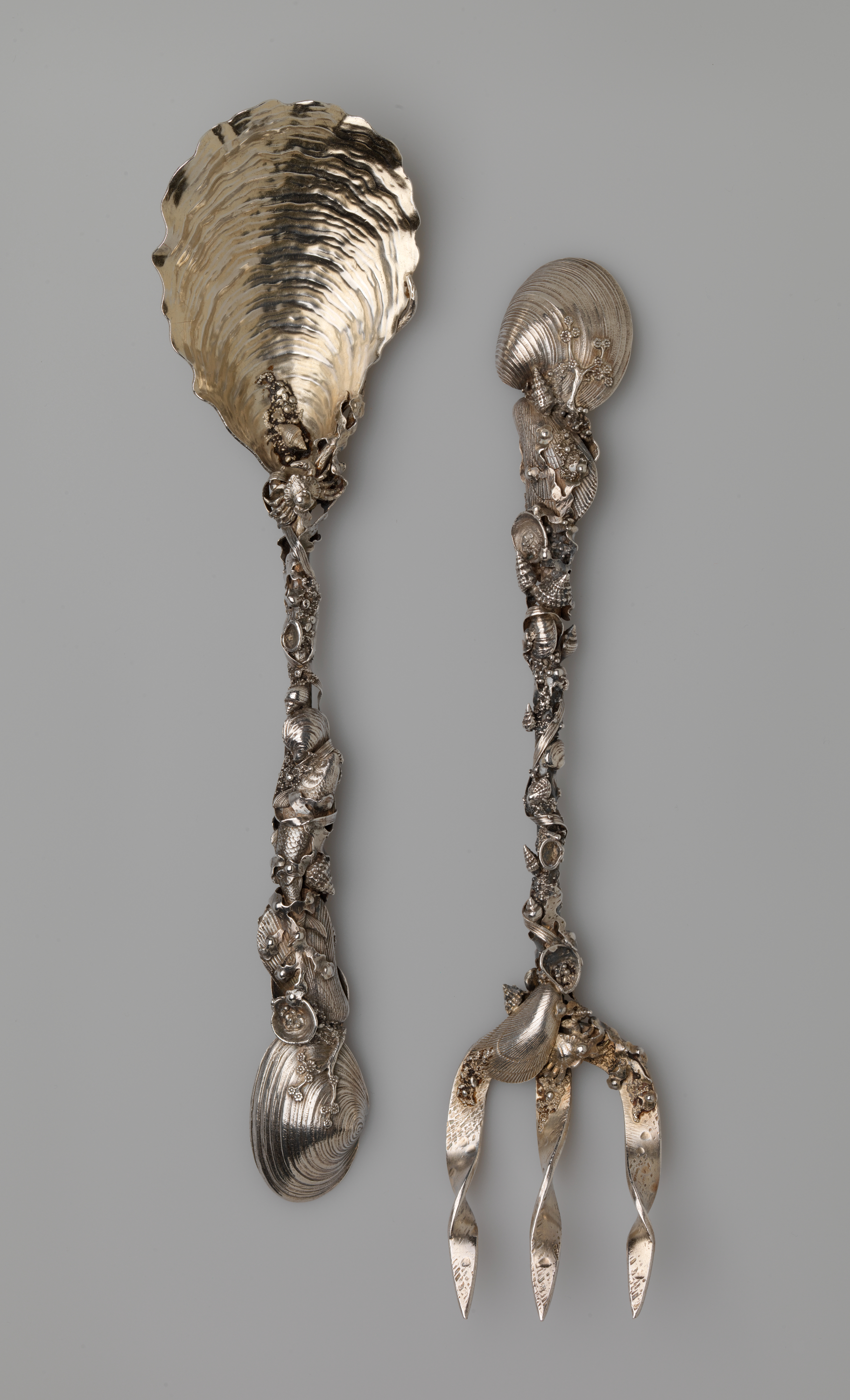 My fingers trace a vine of seaweed as it curls around a silver clamshell. Sand, pearls, and other seafloor deposits all cupped in the shell’s underside coalesce to form the handles of the Museum’s Narragansett salad set—a silver serving fork and spoon made by Gorham Manufacturing Company at the end of the 19th century. Ribbons of seaweed wind up the handles of the fork and spoon, entrapping fish, crabs, and seashells in a tangle of oceanic detritus that makes the salad set so special and emblematic of Rhode Island, the Ocean State.