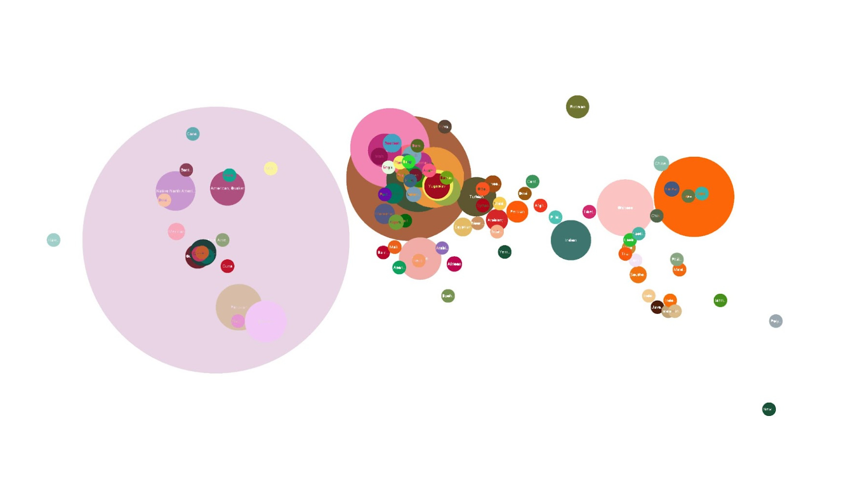 I grouped objects based on the “culture” field as defined by the database. I then organized these into six groups corresponding to twenty-year acquisition periods. Within each group, individual cultures are represented by circles of varying sizes and colors, indicating the number of artworks acquired. However, this model soon revealed inconsistencies and ambiguities in categorization.