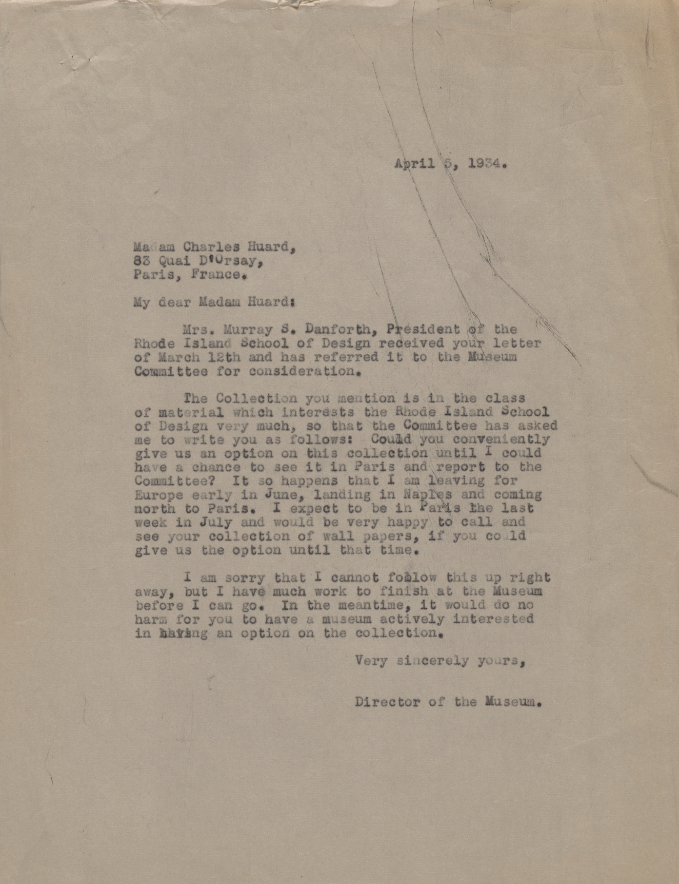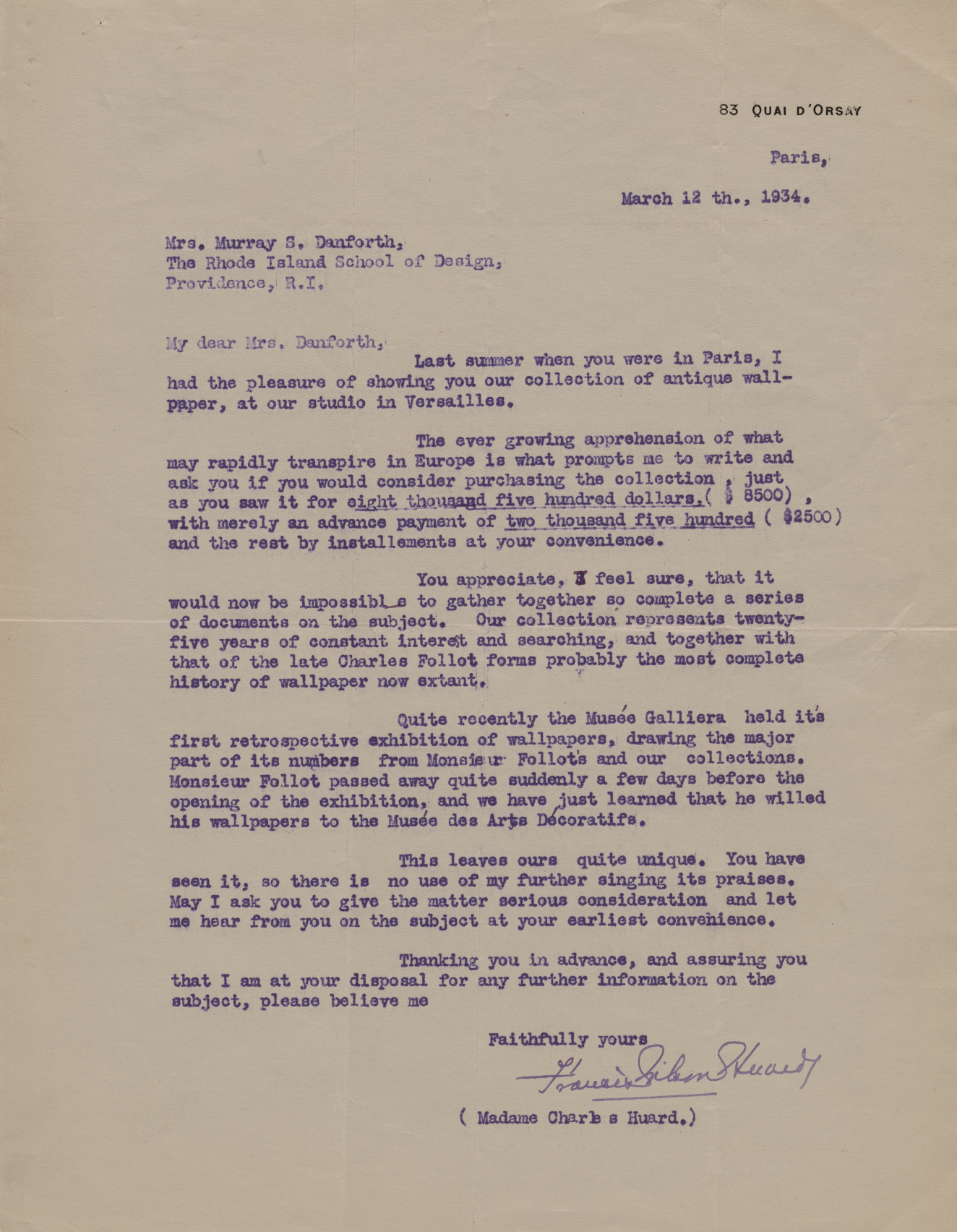 Alongside their business of selling wallpapers that they discovered, the Huards built their own collection of historical examples. They no doubt lived with and enjoyed these works until the murmurs of a second World War caused them to seek out an appropriate home for the collection, much of which was at that point already more than one hundred years old. Documents in RISD’s archives detail the Huards’ 1934 sale of the wallpapers to RISD and suggest that the deal was not solely a financial transaction. In a letter (Figs. 11–12) to RISD president Helen Metcalf Danforth (1887–1984), Frances Wilson Huard stated that “the ever-growing apprehension of what may rapidly transpire in Europe is what prompts me to write and ask you if you would consider purchasing the collection.” The Huards’ desire to safeguard their collection was fueled by their experience during World War I, when most of their belongings were destroyed during the German occupation of France.