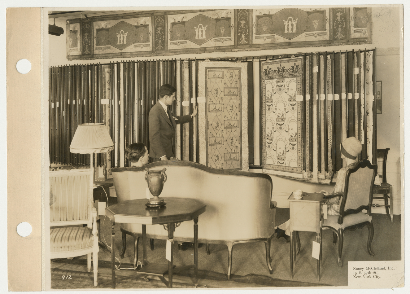 In the 1920s, Charles and Frances Huard developed a keen interest in historic French wallpapers, going so far as to turn their interest into a business. In partnership with American interior decorator Nancy Vincent McClelland (1877–1959) (Fig. 9), the Huards began collecting wallpapers in France to sell through McClelland’s eponymous business (Fig. 10). The vast majority of the wallpapers found by the Huards came directly off the walls of homes in France. Through antique dealers and word-of-mouth, Charles and Frances connected with those who were looking to remove the wallpapers from their homes. They also discovered troves of wallpapers in homes that had been abandoned, perhaps due to financial constraints or displacement caused by World War I and earlier sociopolitical unrest.