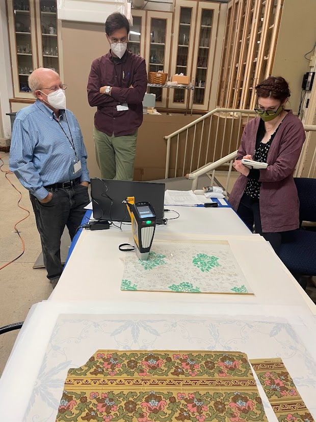 We were able to test a number of wallpapers in the Huard Collection with generous help from the Brown University Geochemistry Department. In particular, Dr. David Murray, senior research associate and facility manager emeritus, and Jamie Pahigian, environmental chemical facility and lab coordinator, were very helpful with both their instruments, analysis, and expertise. Using a handheld Olympus XRF unit, we tested a grouping of different wallpaper fragments, borders, and sheets to find the presence of inorganic elements, specifically heavy metals, including arsenic. To learn more about these findings and the history of arsenic, please read Emily Banas’s essay.