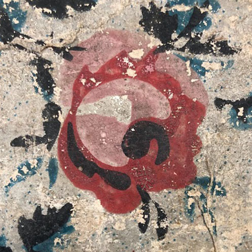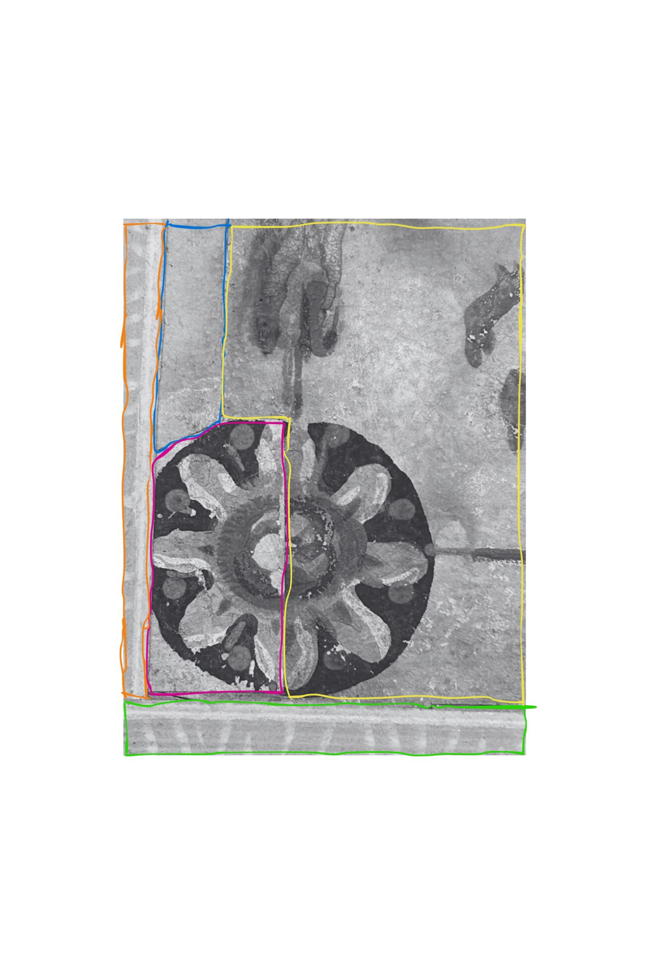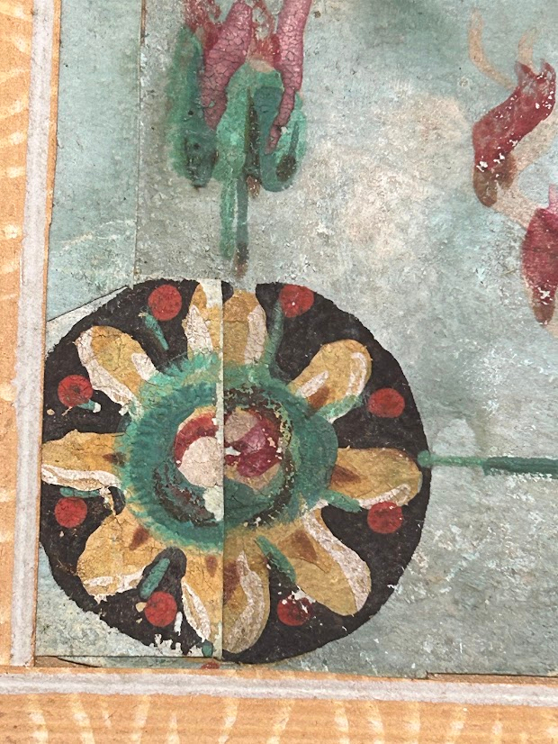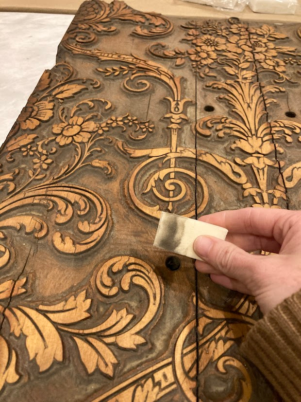The Huard Collection presents a broad range of condition stability and aesthetic challenges. There is no one-size-fits-all treatment, even for similar materials in the collection. Each wallpaper has its own unique history and life that it has lived. This particular wallpaper piece, Muses with Arabesques (34.935), is undergoing treatment at Studio TKM Associates, a conservation firm located in Somerville, Massachusetts. Prior to their work, we were able to do some treatment at the museum. Many of the panels and fragments in the Huard Collection had, at some point in their history, been mounted to an acidic craft paper, pasted onto a canvas, and stretched onto wooden supports so that they could be displayed and stored vertically. We removed each panel from its frame, and many from their canvas backing. The brittle and acidic paper the wallpaper was glued to likely caused structural damage to the pieces. Acidity inherent within the cells makes the paper vulnerable.14 Using dry polyurethane sponges, we cleaned many decades of soot and dust accumulation from the face and reverse of each piece. The grime we picked up with the sponges was black soot, likely from the coal-burning furnaces and fireplaces commonly used earlier in the lives of these objects. We then placed the wallpapers in acid-free folders with acid-free glassine paper separating each piece to protect the surfaces. The folders are now housed in flat-file drawers.