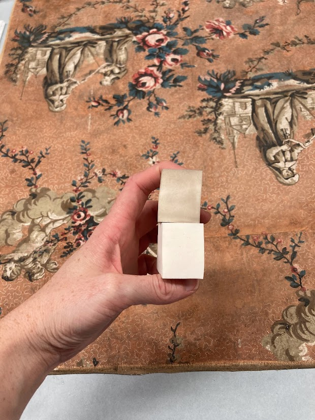 Having multiple components of this process in a collection is unique, and it allows us to learn more about the production of wallpaper, see instances of the artisans’ hands, and visualize the history and life cycles of these works. To preserve the Huard Collection, we have to understand how to care for the materials that the artists and craftspeople used. Each material has specific requirements to preserve its structural integrity, and in turn to maintain that object’s intangible cultural heritage. Overall, the best way to do this is to house works in a storage environment that is clean and temperature and humidity controlled.1 This preventative maintenance is considered the best practice for works on paper.