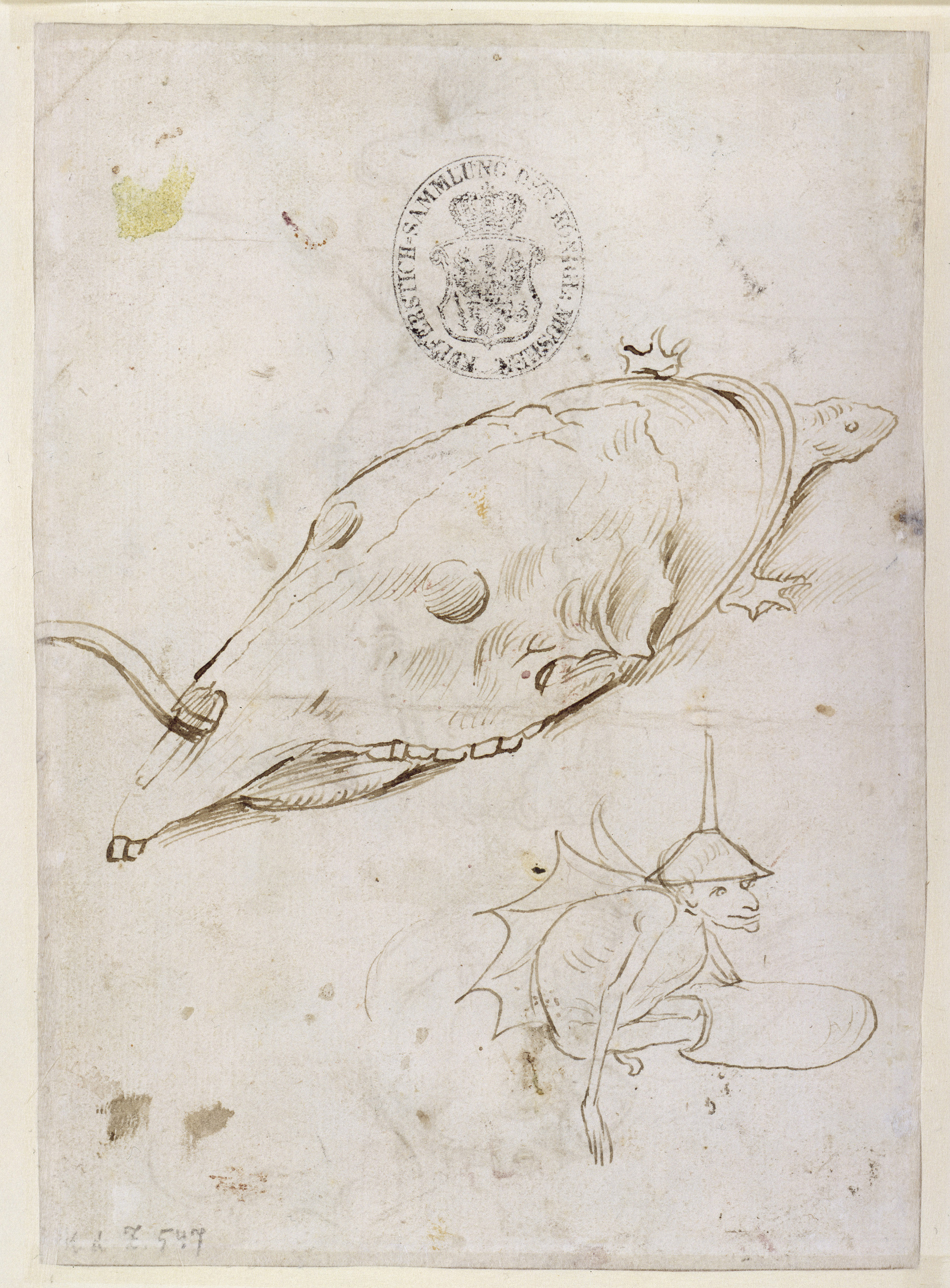 When he briefly mentioned the Netherlandish artist Hieronymus Bosch in his Lives, Giorgio Vasari evocatively described the images he created as “reveries, eccentricities, dreams, and imaginations.” 1 A member of Bosch’s workshop probably made this drawing as a training exercise or as a way to replicate and preserve Bosch’s original designs. It appears to be a valuable record of lost inventions: four of its fifteen monsters are faithful copies derived from a double-sided drawing (Figs. 1a and 1b), now in Berlin, widely accepted as a Bosch autograph. The swan-headed hybrid creature in the upper left corner and the fish-faced monster next to it were copied from the recto of the Berlin sheet, although not in the same respective position; the bat-winged figure with a funnel and the turtle whose shell is a horse skull (lower right) are derived from the verso. Richer in detail and exhibiting a greater tonal range (due to the varying pressure on the nib of the pen), the Berlin sketches certainly came before the RISD drawing, whose relative tonal flatness and unresolved details are clear signs of copying. The figures in the RISD sheet are repositioned on the page in new arrangements, suggesting the student had access to numerous Bosch drawings and selectively copied from different sheets on the same page. The nine remaining figures are unknown in extant works, so it is likely they are the only remaining evidence of drawings by Bosch that are now lost.