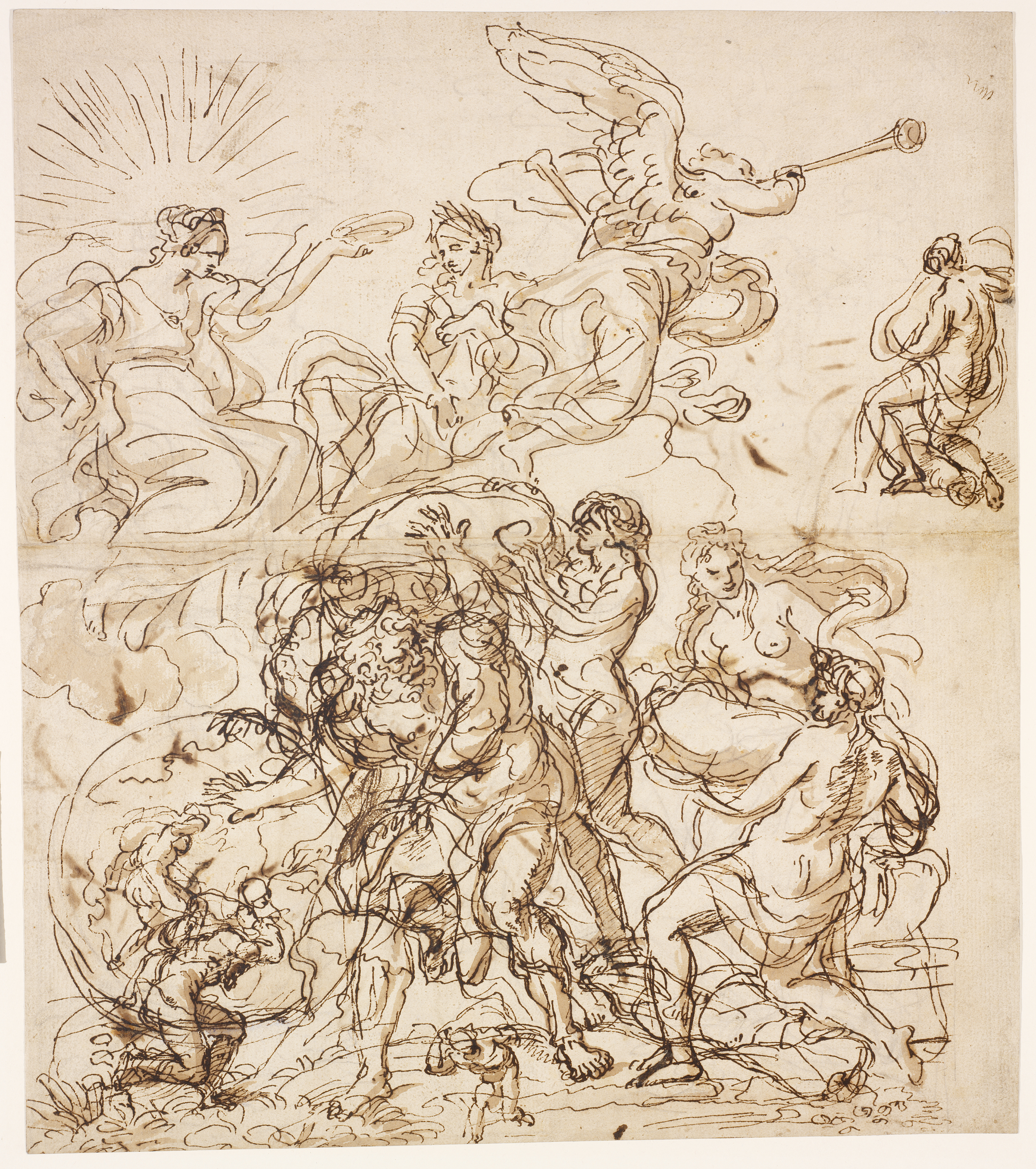 The present drawing is not only a vivid example of Maratti’s virtuosic and vivacious use of the pen but also a fascinating document of his process of invention. Giving free rein to his fertile creativity, he filled both sides of the drawing with ideas, and he continued revising the composition on at least two further sheets. A slightly smaller pen and ink drawing, now at the Uffizi (Fig. 1), represents the next step in the development of the RISD composition. Maratti kept the main elements in place but moved Victory to the upper center and added a foreground and background as he continued searching for the perfect compositional solution for Hercules. In this case, he used vigorous parallel hatching marks instead of wash to define lights and shadows.1