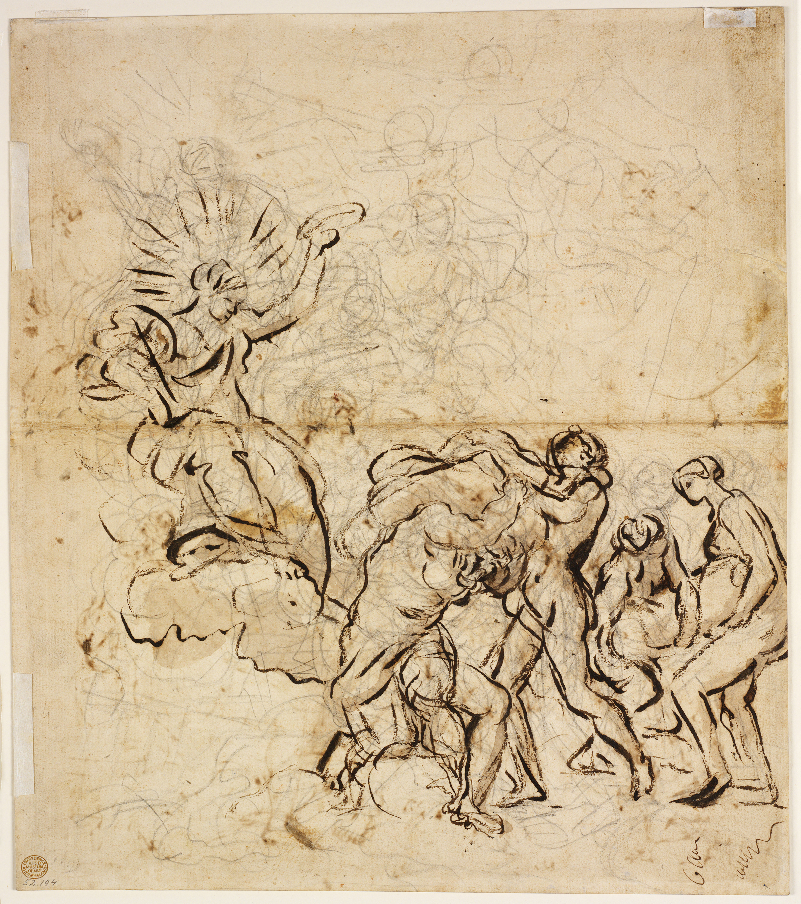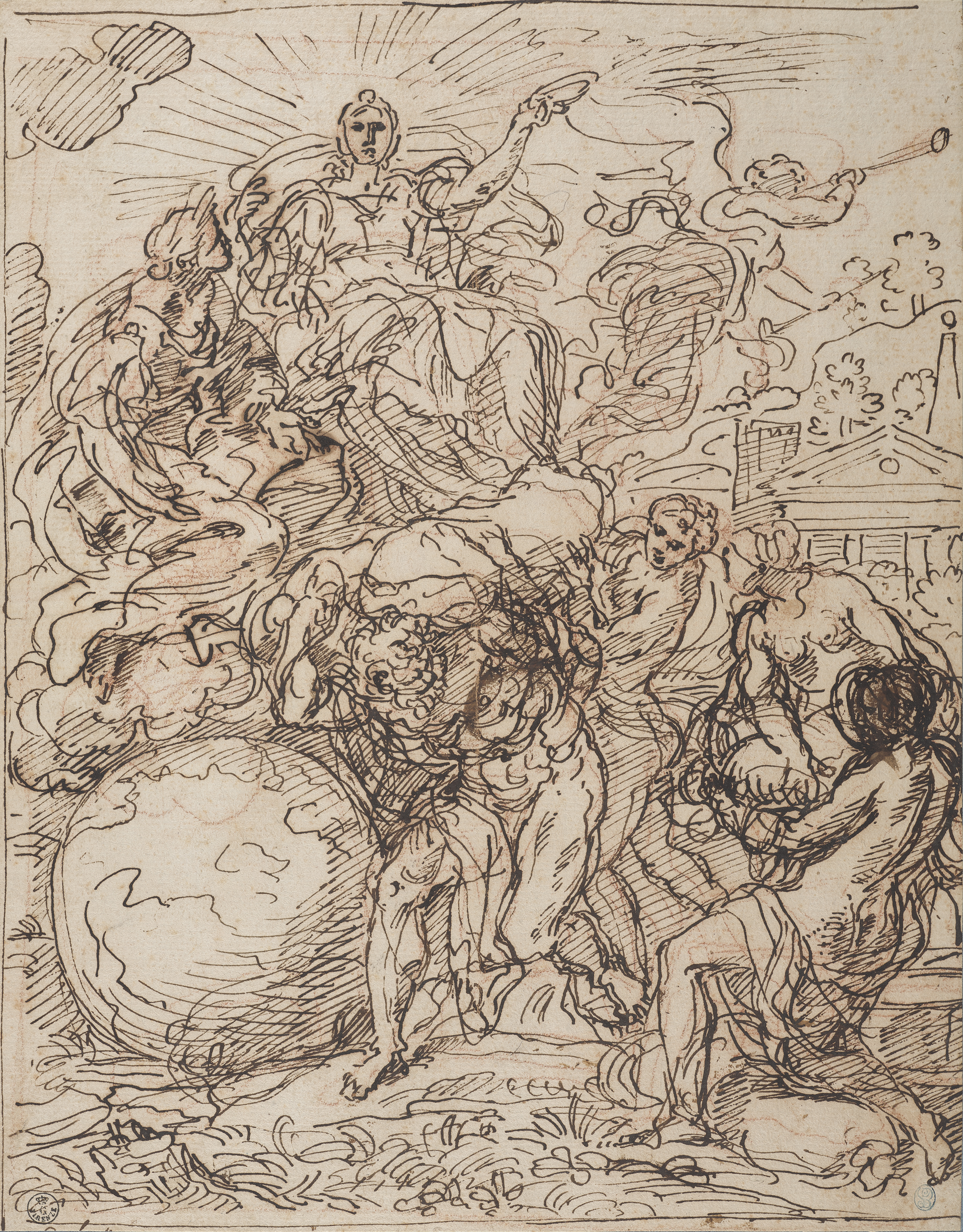 On the verso of the drawing, Maratti used a relatively thick, dry brush dipped in ink to extract and define the composition out of a tangled web of light, sketchy, almost abstract marks in chalk. On the left, a personification of Victory holds aloft a crown while three figures help the crouching Hercules assume the burden on his back. Having established the general position of figures, the artist then turned the sheet over and took up a quill pen. With a few open, fluid lines, he once again placed Victory in the upper left, accompanied by other personifications including a winged Fame sounding a trumpet. In the center, a denser flurry of lines conveys the impression of Maratti’s pen laboring to establish the exact pose of Hercules, whose writhing, twisted contours are multiplied and fragmented. A large sphere representing the world rests on the ground beside the hero. In the space within it, the artist inserted two studies of Hercules’s pose from different angles. A third miniature variant of the struggling Hercules appears between his legs in the lower center. Lastly, Maratti applied a pale ink wash with a brush to explore how light would fall on the composition.