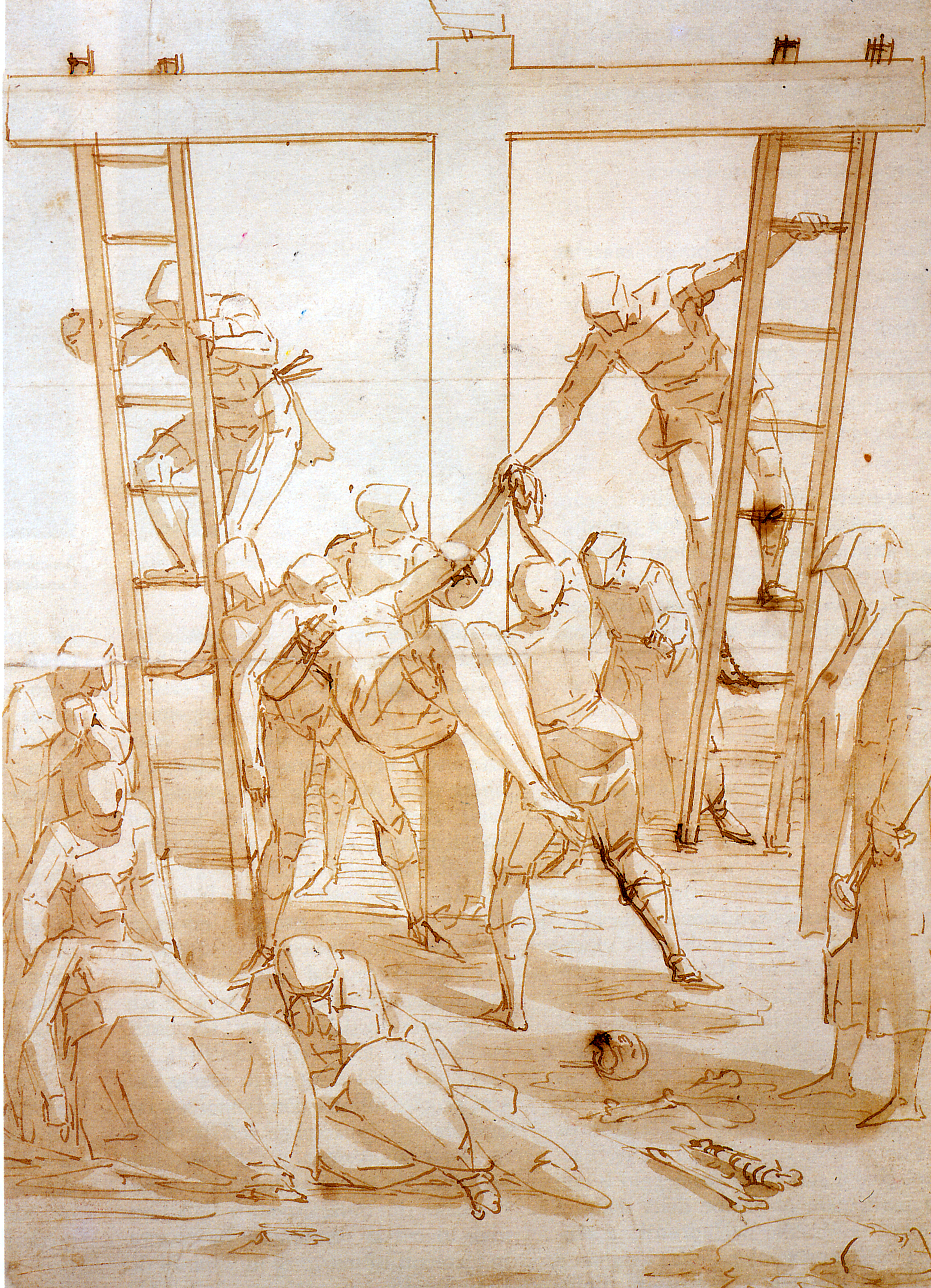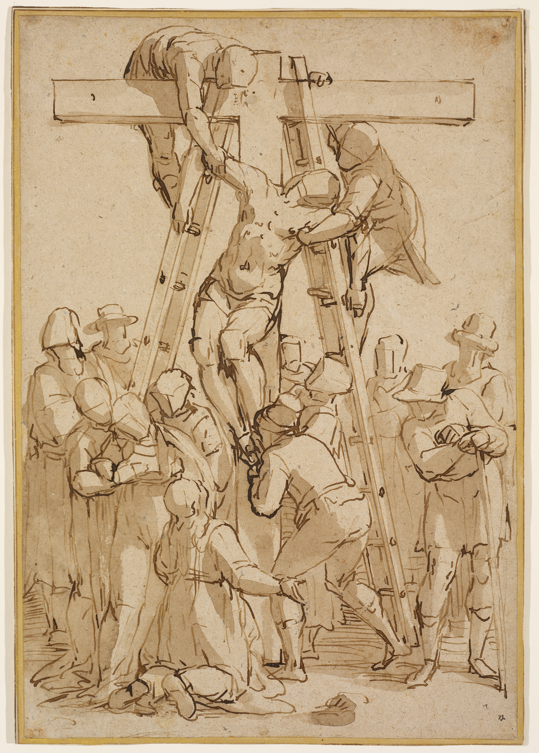 Luca Cambiaso, Descent from the Cross, ca. 1570. Pen and brown watercolor on white paper; 34.5 x 24.4 cm (13.58 x 9.6 inches). Galleria Regionale della Sicilia Palazzo Abatellis 5237/95