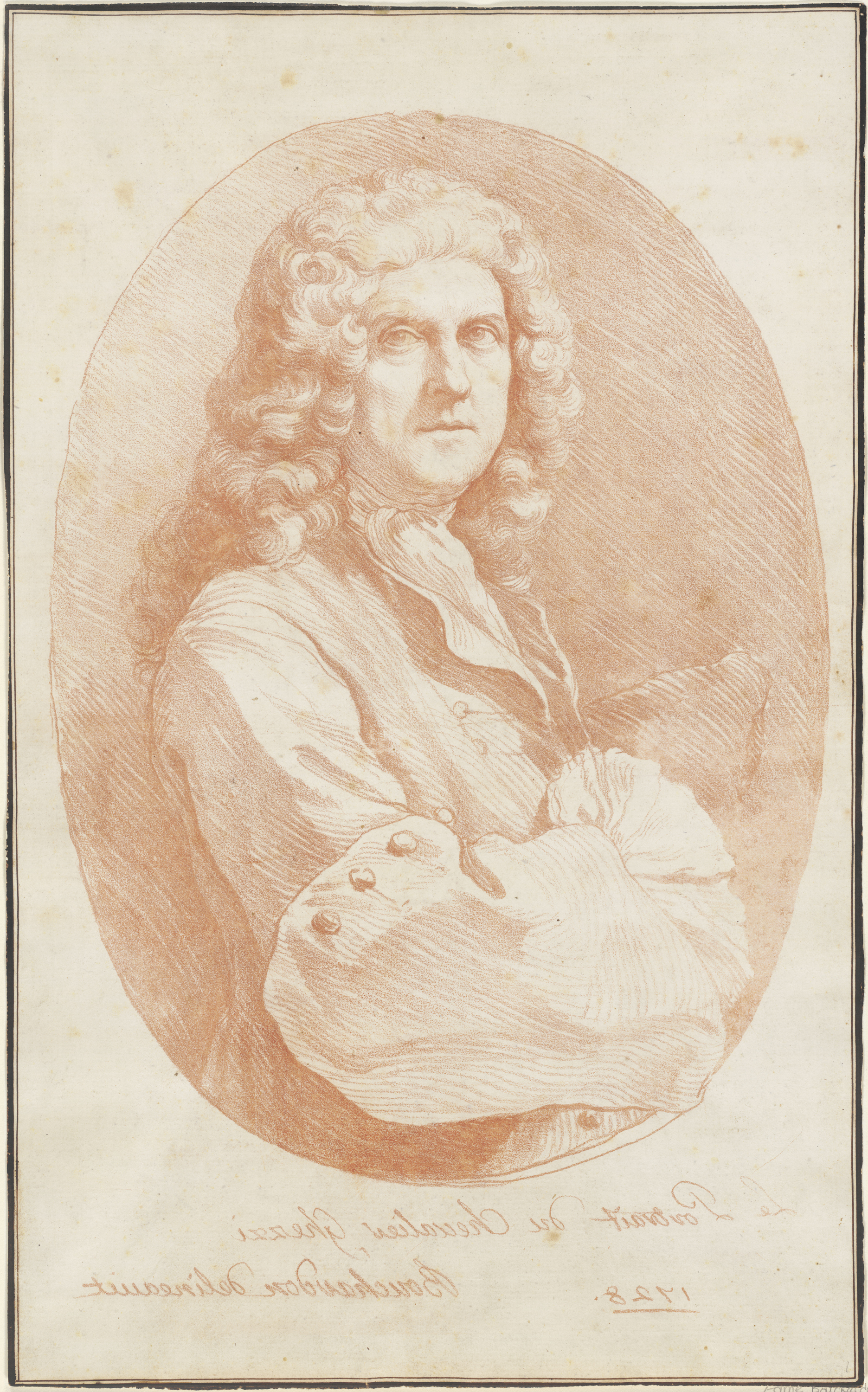 Few works, however, have the evocative, true-to-life quality of the RISD portrait, with exception of the only other two known portraits from Bouchardon’s time in Rome. The first is a poignant self-portrait with eyes closed, hands held in a gesture of exhausted resignation (Fig. 1); the other is a portrait of his good friend and fellow artist Pier Leone Ghezzi (see Cat. 42 ↙), known today only through a rather flat counterproof at the Yale University Art Gallery (Fig. 2). A personal significance or connection, therefore, appears to have added a certain vital warmth to Bouchardon’s technical facility and acute powers of observation. Furthermore, the fact that Bouchardon was attracted to men may also inform how we view the present work, and contribute to explaining why this lovingly executed drawing of the young Aliberti is endowed with a power and individuality absent from much of his other work.6 | JG