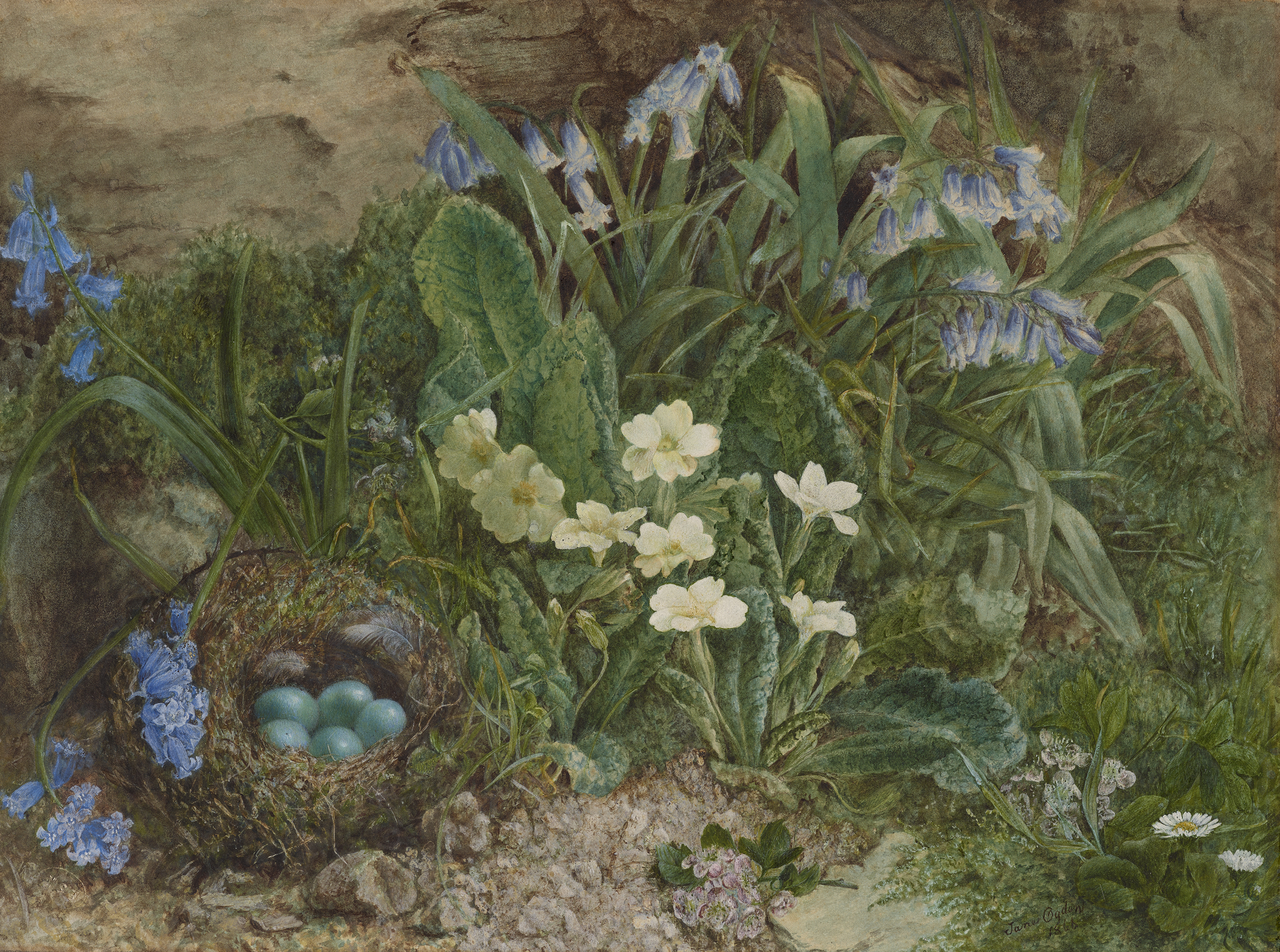 In 1866, Jane Ogden, a twenty-one-year-old student at the Manchester School of Art, won a bronze medal and a book prize for the “flower painting” she submitted to the National Competition of the Department of Science and Art, South Kensington.1 The date and composition of Bluebells and Primroses with a Bird’s Nest suggest that it was the winner of this award, as does the meticulous technique of the finished drawing.2 Ogden’s subject also demonstrated close study of the work of William Henry Hunt, whose signature motif had earned him the sobriquet “Bird’s Nest” Hunt. Hunt’s fine stippled modeling and use of opaque white influenced generations of British painters in watercolor, including John Ruskin.3