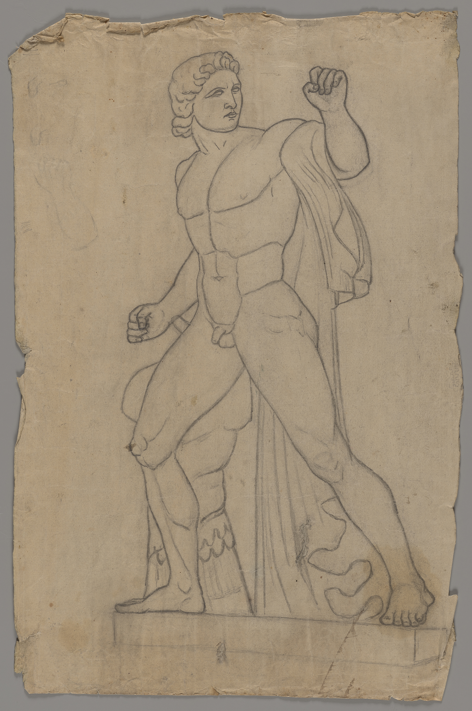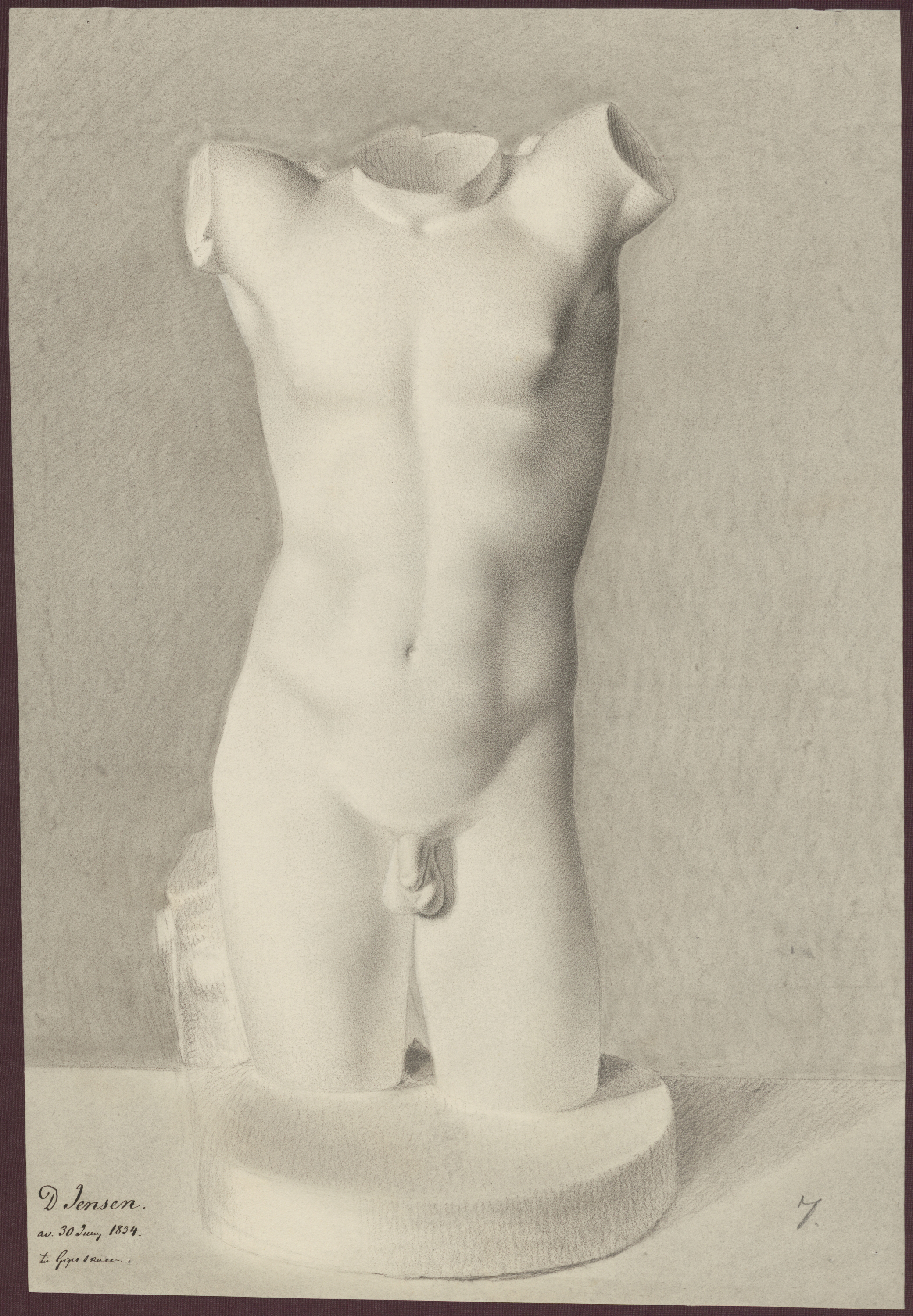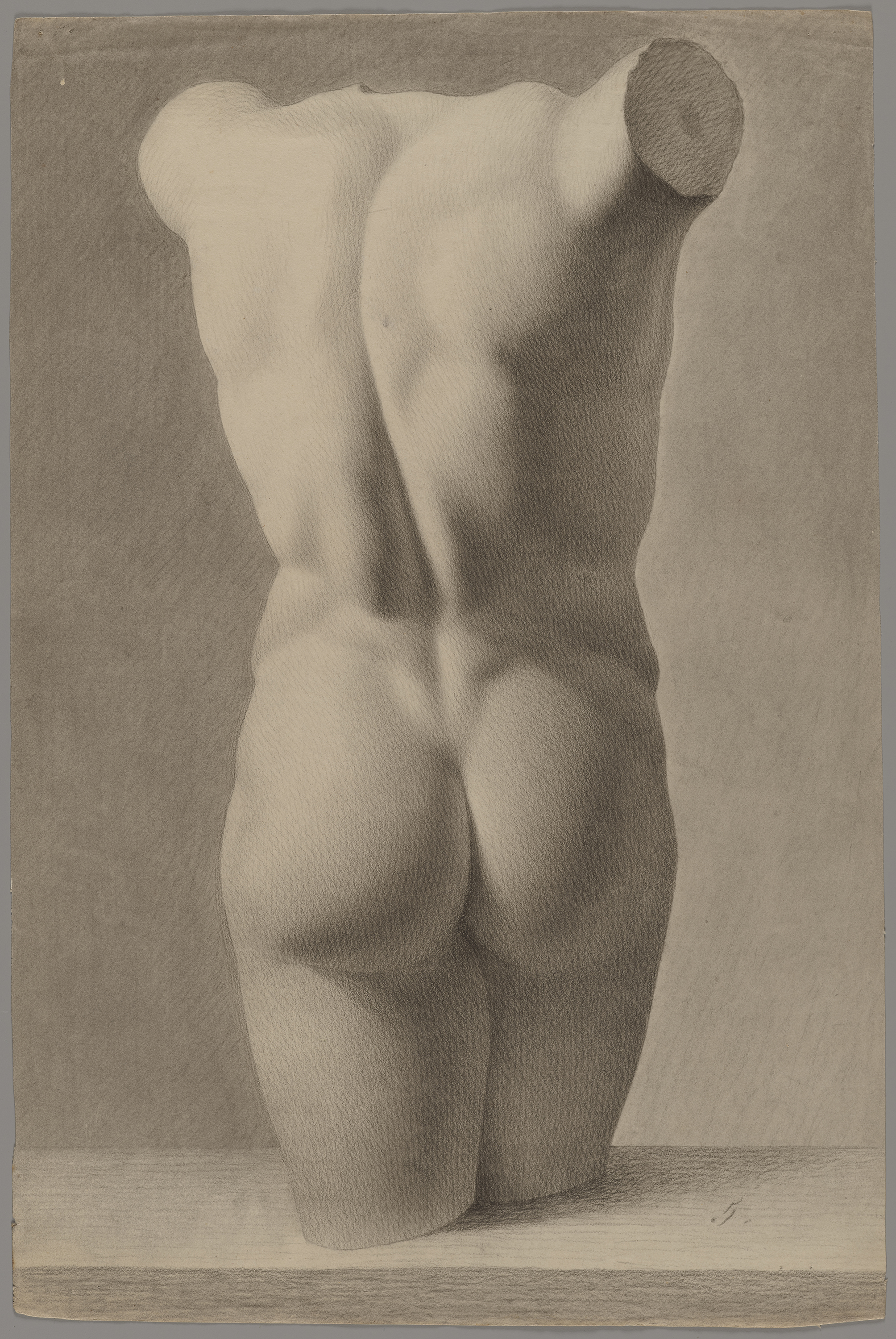 This large and highly finished drawing of a muscular male torso seen from behind was made by a young student at the Royal Danish Academy of Fine Arts. As the truncated limbs make clear, the artist was sketching from a plaster cast. Casts would be chosen and placed on a stand by the instructor in a drawing class. The exercise of drawing from a cast was intended to sharpen the students’ powers of observation and to train them in a highly disciplined and refined graphic technique. Sketching from a static model allowed students to master the rendering of volumes and of the fall of light on three-dimensional objects. To make his study of this torso, the artist employed an intricate mesh of sinuous cross-hatched lines that intersect at acute angles while following the curves of the forms they describe. Shadows and shapes are created by varying the density of the lines and the pressure on the charcoal. This systematic graphic vocabulary was derived from engraving, which used intersecting lines of different width and density to create tonal range and textures.