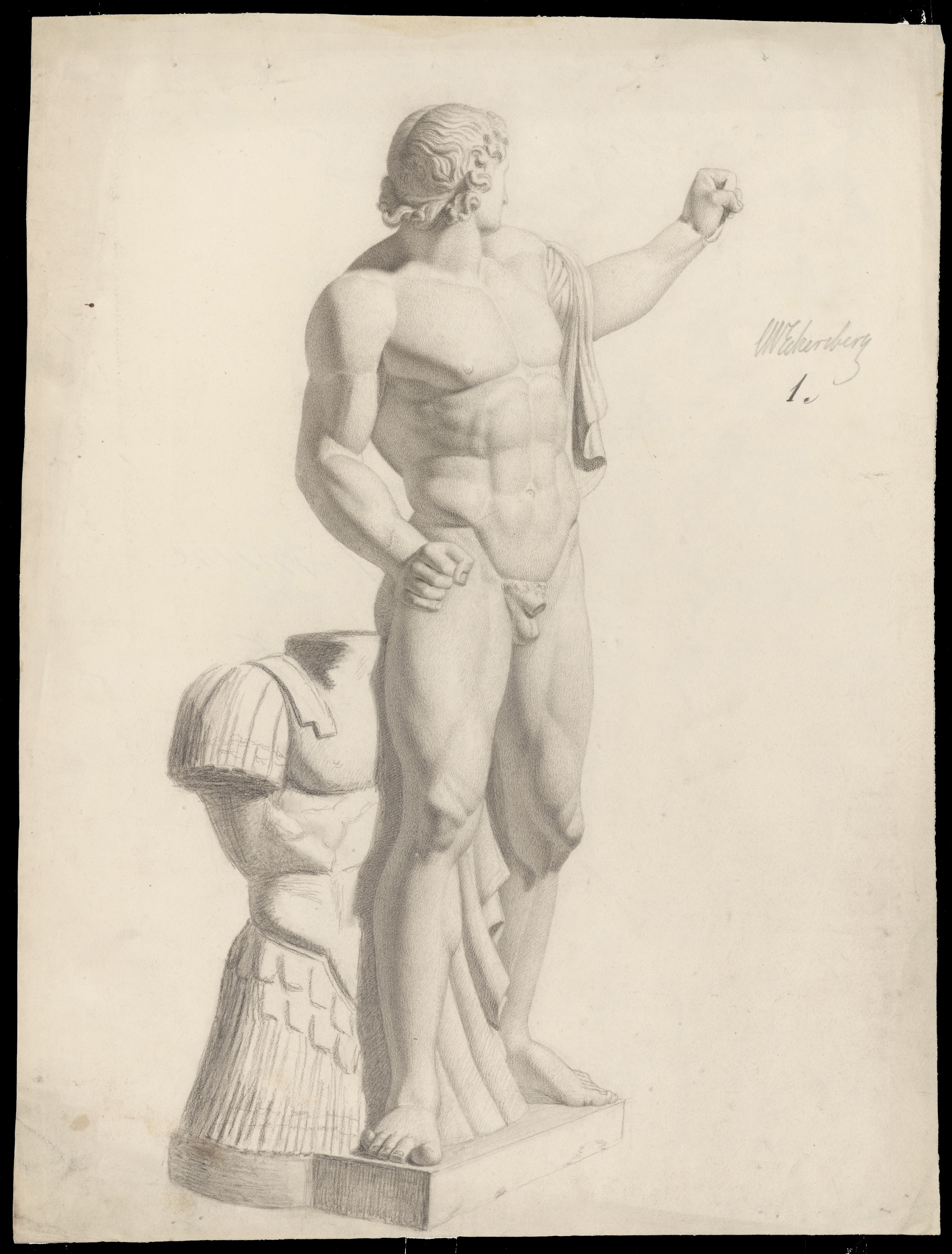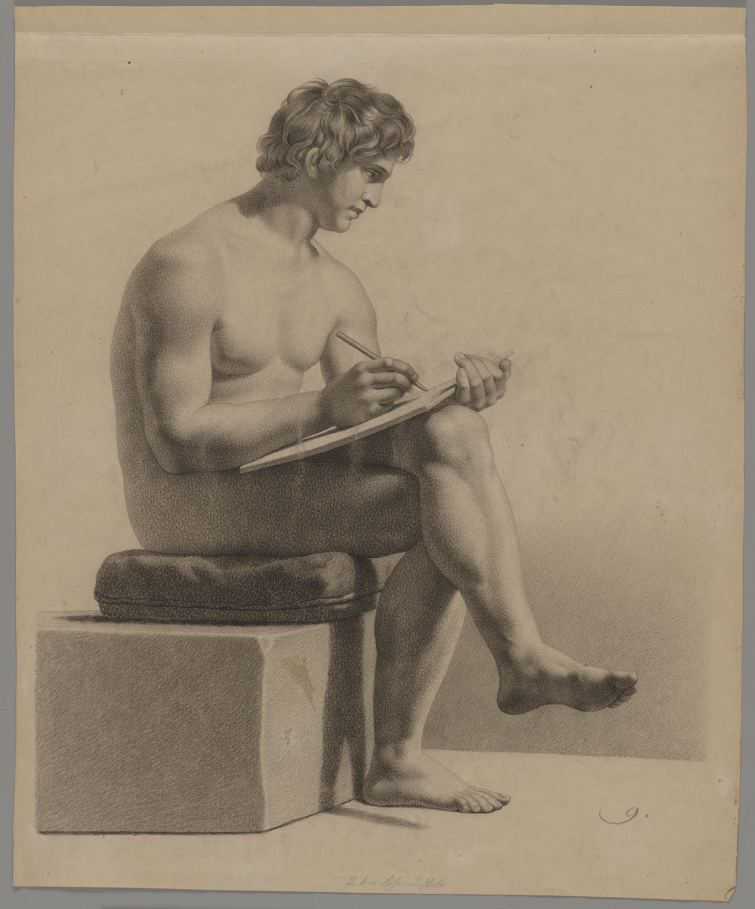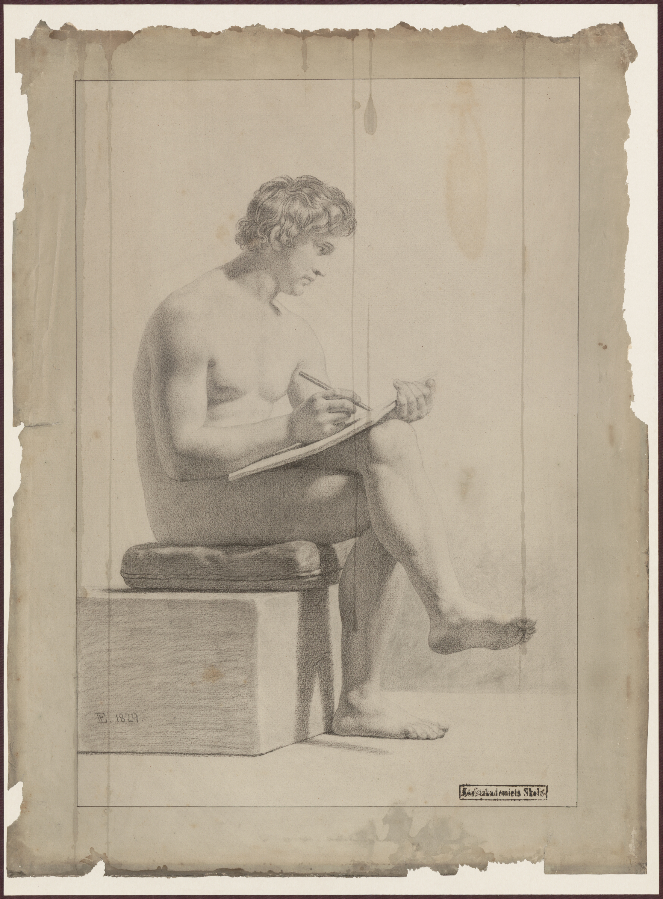 The present drawing is part of a portfolio of twenty-nine drawings and one print that documents Anton Løvenberg’s progress through the first two phases of this curriculum. Since the means and tools of instruction remained so consistent for so long, many of Løvenberg’s drawings bear striking similarities to sheets by other students at the academy, now kept at the Danish National Art Library. For instance, a drawing by Anders Trulson (Fig. 1a) was executed in 1893 from a different angle of the very same plaster cast shown in the RISD sheet, which is perhaps the same model shown in a drawing signed in 1834 by David Jensen “in the Plaster School” (Fig. 1b). Another outline drawing by Løvenberg (Fig. 2) shows him studying a plaster cast of one of the Dioscuri; the same cast was depicted from the opposite angle by an unknown student (Fig. 3). Other sheets in the portfolio, however, are such exact replicas of ones from the academy that they must belong to the first level of instruction, when students copied a drawn model provided by the professor. A case in point is Løvenberg’s drawing of a boy writing (Fig. 4), which reproduces an academic study by the painter and influential professor Christoffer Wilhelm Eckersberg (Fig. 5).