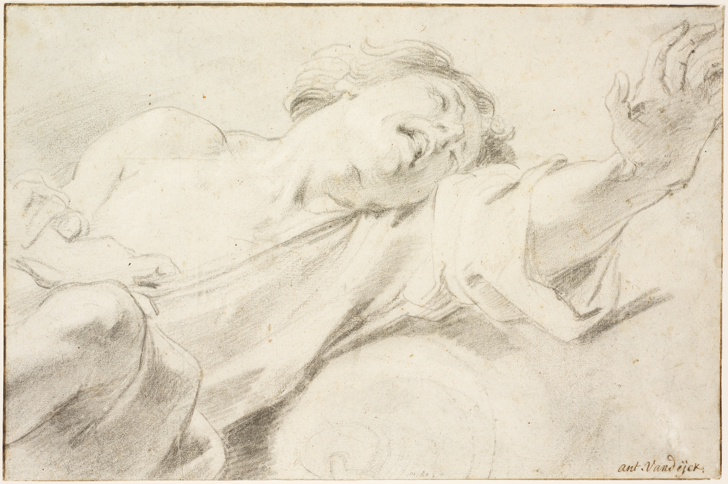 The Flemish painter Anthony van Dyck made this black-chalk sketch from a posed live model to study the position of one of the figures for his painting The Taking of Christ, now at the Prado (Fig. 1). Frozen in a moment of dynamic physical struggle, the drawing corresponds to the twisting body of Malchus in the lower left corner of the large painting. In the New Testament story of Jesus’s betrayal and arrest, the apostle Judas led a group of Roman soldiers to the garden where Jesus and the other apostles were wont to meet. Judas identified Jesus for the guards by kissing him. As the soldiers moved in, the apostle Peter drew his sword and cut off the right ear of Malchus, a servant of the high priest, in an attempt to prevent Jesus’s arrest. In this drawing, which shows Malchus in the moment before Peter’s strike, van Dyck handled the chalk delicately and evenly. He confidently outlined the contours of the dramatically foreshortened figure with fluid, unbroken marks. For the shading, he used tightly packed, even parallel hatching, which he softly blended in the lighter areas. Spare in its use of materials, the study nonetheless achieves a remarkable effect of plasticity and movement.
