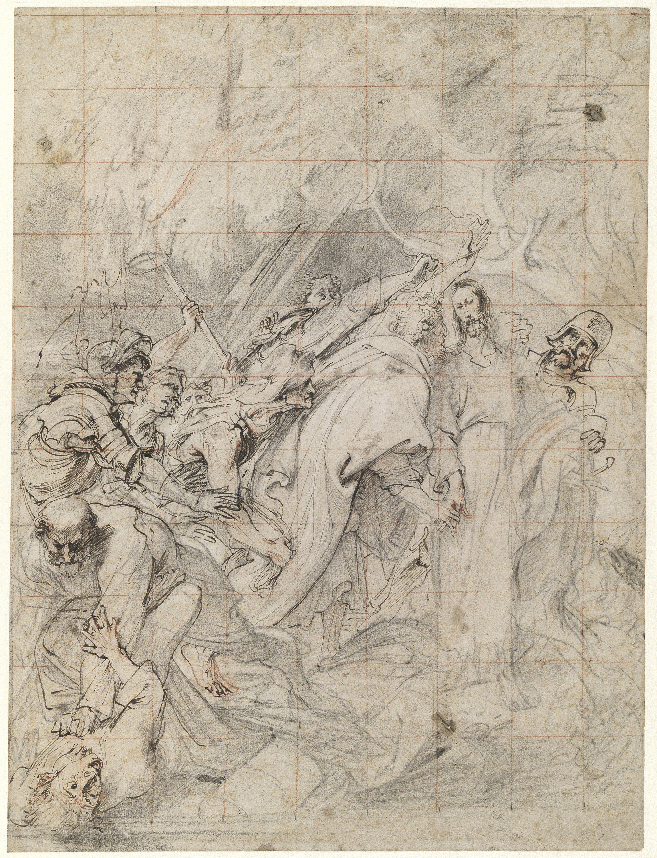 According to his early biographer, the twenty-one-year-old van Dyck presented his esteemed teacher Peter Paul Rubens with the large canvas of The Taking of Christ just before leaving for Italy. Rubens greatly admired the painting and kept it in his house until he died.1 The Taking of Christ now in the Prado’s collection is one of three slightly different painted versions of the subject. A relatively large number of surviving drawings related to these compositions record van Dyck’s process of devising and progressively modifying the composition.2 Van Dyck first made loose compositional sketches using pen and ink and brush to work out the general arrangement of figures. His early ideas did not include the struggle between Peter and Malchus, but rather a group of apostles sleeping. Sketchy pen studies, such as a drawing in Rotterdam (Fig. 2), show van Dyck imagining what the confrontation between the two could look like. Later, in a much more finished drawing that was squared for transfer (Fig. 3), Peter and Malchus are included in the lower left corner, albeit facing outward, toward the viewer. The latter drawing presumably was preparatory for the painted model now in Minneapolis (Fig. 4). In the transition from a highly detailed painted study to full-size painting, van Dyck decided to rotate Peter and Malchus sideways. RISD’s figure study, showing Malchus falling on the overturned lantern and pushing away Peter’s hand, was executed to work out that last-minute alteration.3 | JG