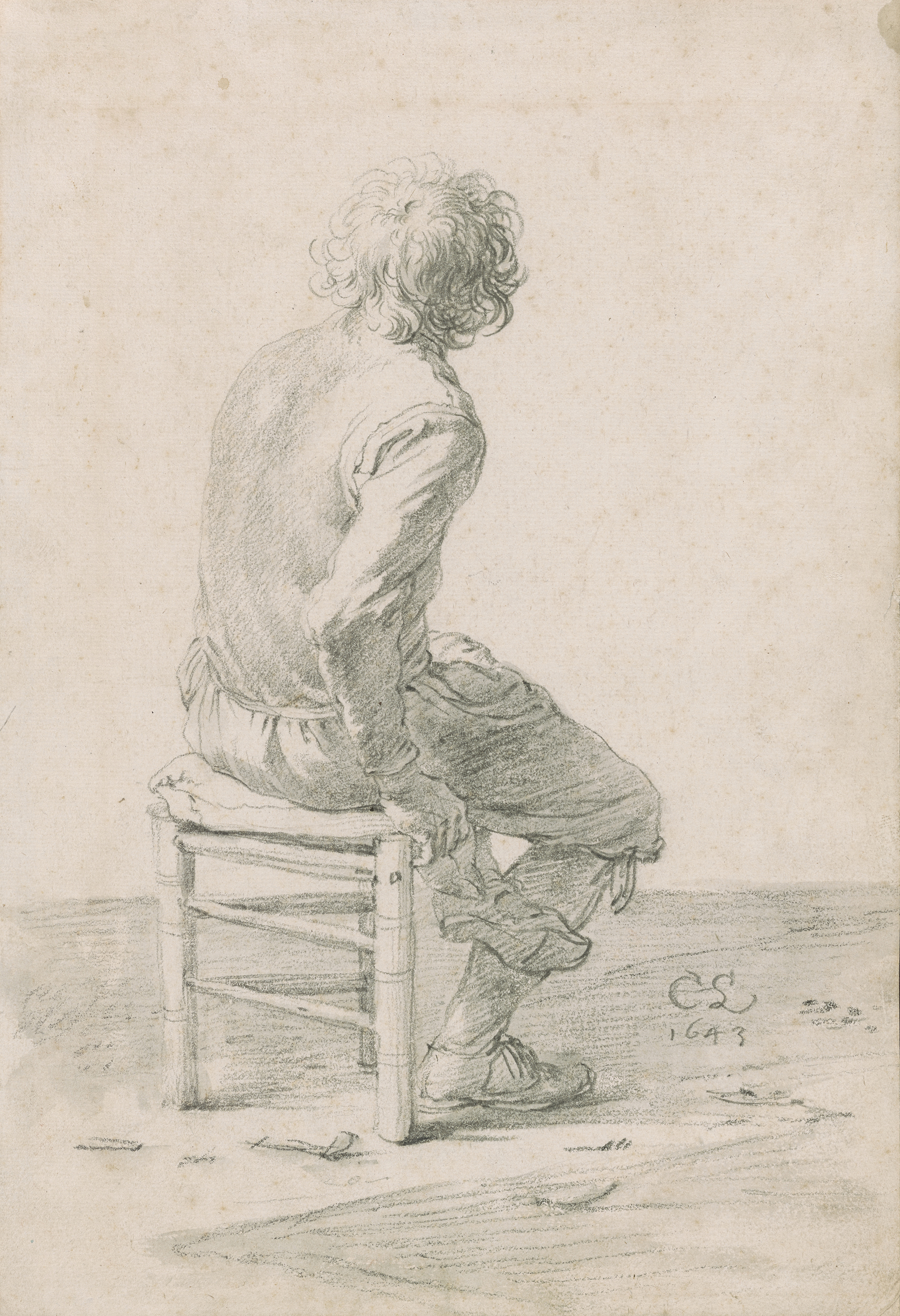 Cornelis Saftleven, A Young Man Seated on a Stool, Seen from Behind, 1643. Black chalk and gray wash on paper; 29.5 x 20.1 cm (11 5/8 x 7 15/16 inches). Purchased on the Fellows Fund 1977.16. The Morgan Library & Museum, New York