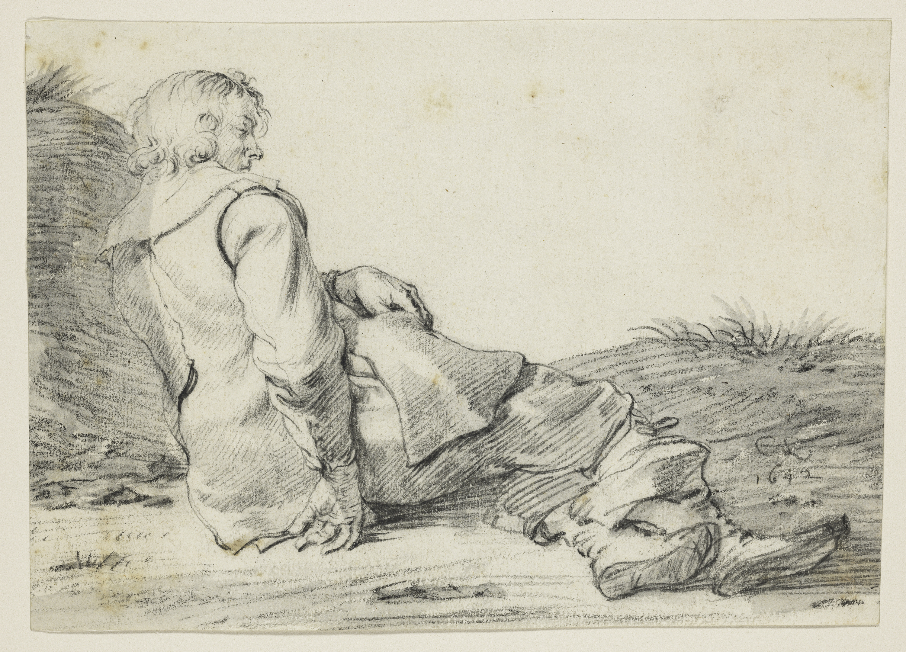 A young man sits on the ground in a relaxed, informal pose. Hair tousled, feet bare, he leans on a rock and looks into the left distance, offering his strict profile to the viewer’s gaze. The artist executed this study using a combination of dry and wet media: black chalk for the line work paired with a gray-blue wash applied with brush. Black chalk was Saftleven’s favorite medium, and he used it deftly, both to draw sinewy, wiry outlines and to add tonal depth with vigorous parallel hatching.1 The hatching is both incisive and irregular, with patches of lines of varying strength, thickness, and length extending in different directions. After having executed most of the drawing, Saftleven enhanced the areas of shadow with subtle but noticeable wash. Once the wash had dried, he reinforced some lines in chalk, which sits on top of the gray tone. Lastly, he signed and dated the drawing with the initials CSL interlaced in a monogram and the year 1642.