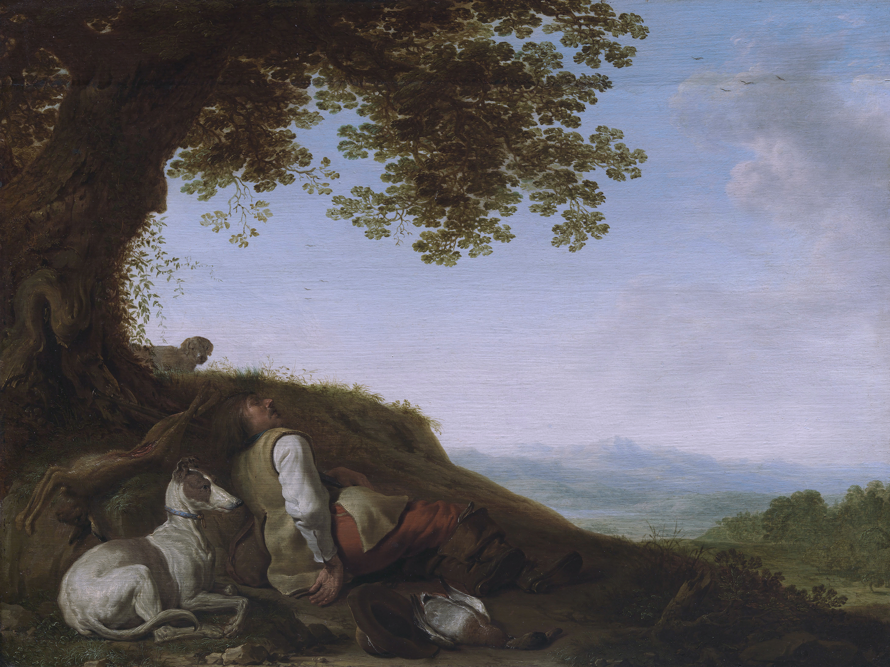 Cornelis Saftleven and Herman Saftleven, Landscape with a Sleeping Hunter and a Greyhound, ca. 1642–1643. Oil paint on panel; 39 x 53 cm (15 3/8 x 20 7/8 inches). Wikimedia Commons. Private collection of Maida and George S. Abrams, Boston
