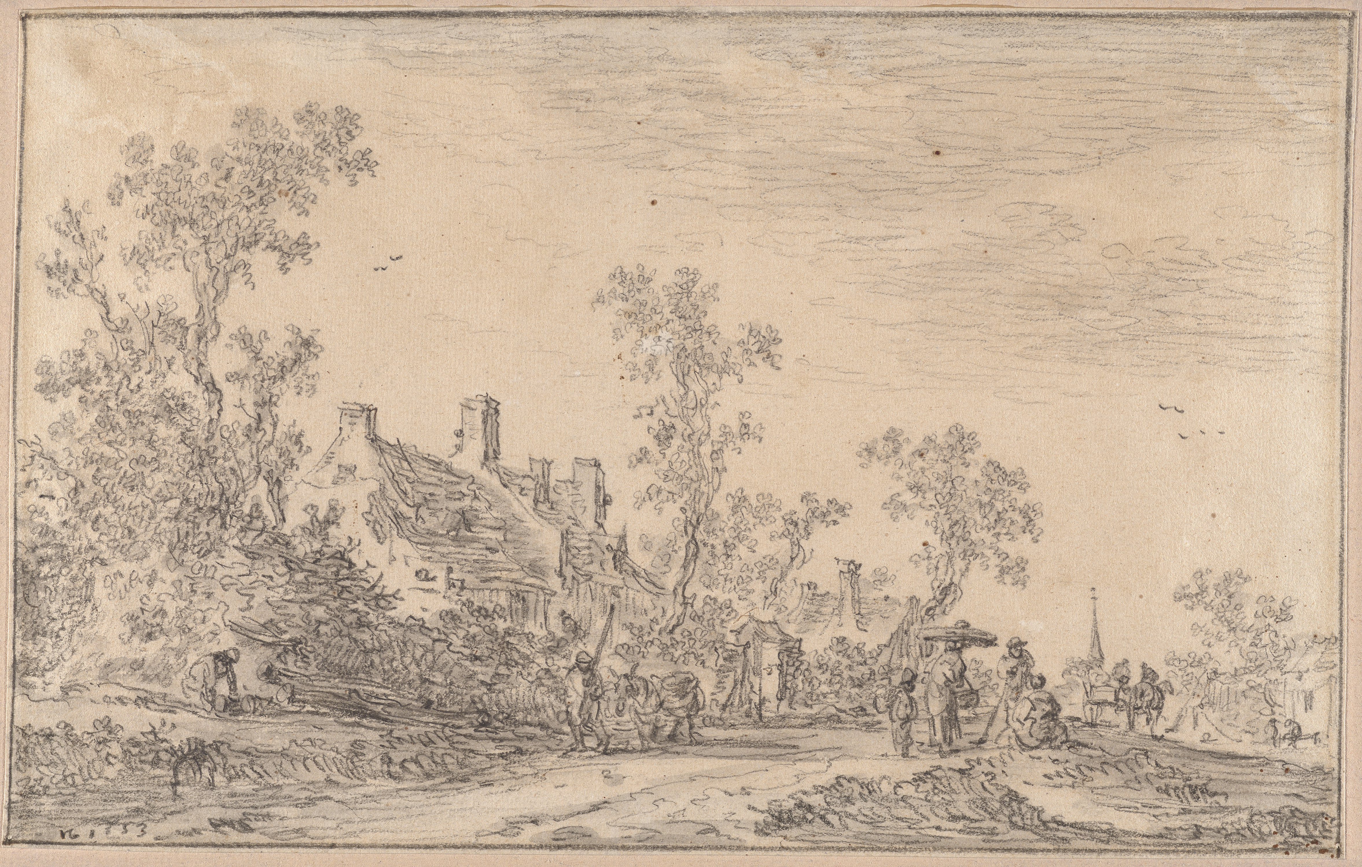A village road diagonally intersects the foreground of this drawing. Along it, groups of sketchily defined figures go about their daily lives—working, traveling, or pausing to converse in small groups. A few cottages behind them emerge between the trees and vegetation that skirt the country lane, while in the distance at right a church spire rises above the other buildings. Jan van Goyen, an important landscape painter and prolific draftsman, was known for this type of view: a scene of country and village life dotted with everyman characters and small genre vignettes. The drawing also reveals the influence of Esaias van de Velde, with whom van Goyen had trained between 1617 and 1618.1