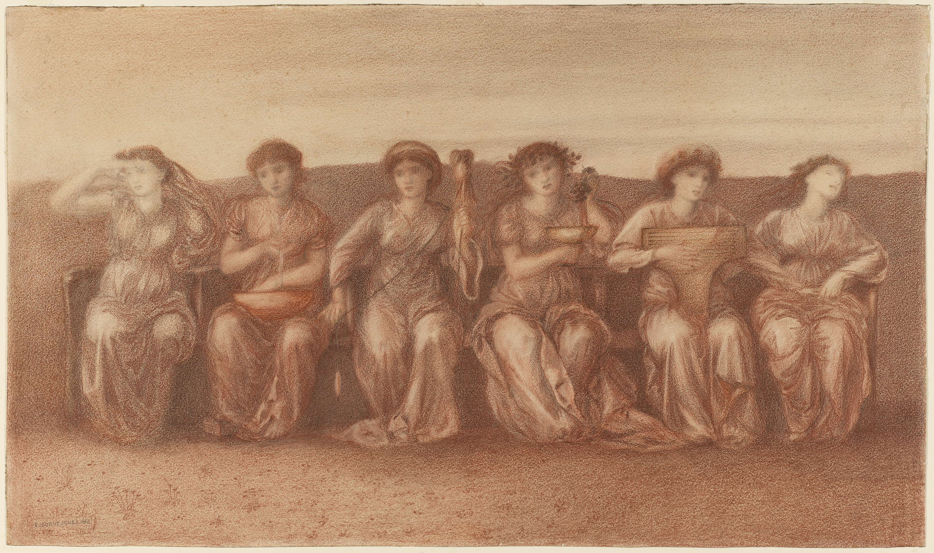 Six female figures draped in voluminous classical robes sit next to each other in a simplified landscape suffused with a hazy, dreamlike atmosphere. None of the figures engage with the viewer or interact with each other; each one is completely absorbed in her own symbolic gesture or activity. Burne-Jones executed this drawing by softly blending red and black chalk, achieving an evocative painterly effect. The artist’s handling of the medium was extremely delicate: he began by virtually caressing the chalk onto the paper. As the artist blended the medium on the sheet, the outlines of figures, already faint, blurred into the surrounding tone. Only the symbolic objects held by the figures, drawn by chalks sharpened to a finer point, received clear definition. Small stylized flowers, arranged in a pattern-like disposition that recalls Renaissance tapestries, emerge from the otherwise indistinct foreground.