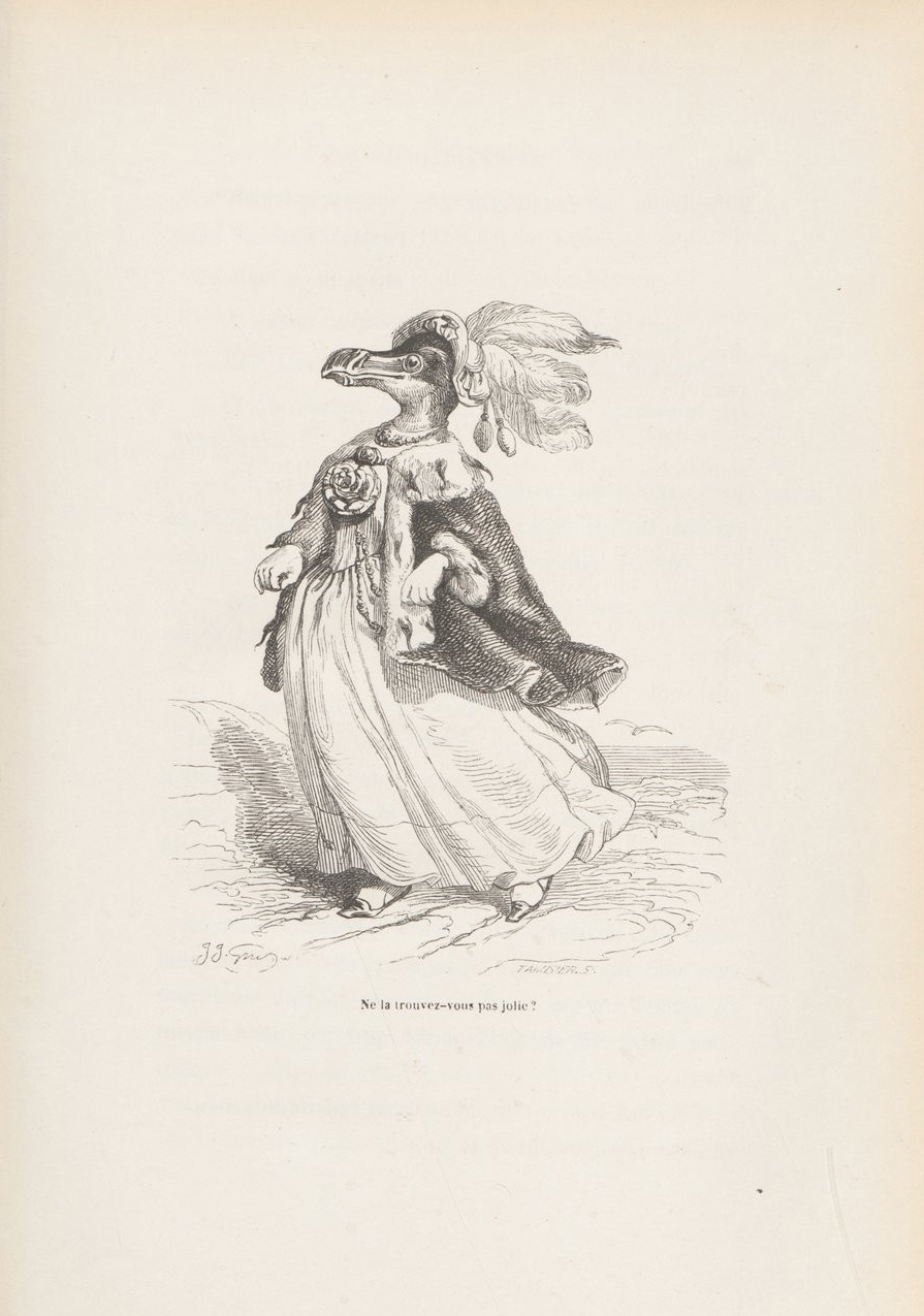 A hybrid creature with the head of a penguin and the body of a human steps forth, her feet tightly squeezed into dainty, pointed shoes. She is finely attired in a billowing gown decorated with an oversized flower. Her shoulders are covered by an ermine-trimmed capelet and she sports an extravagantly feathered hat. This improbable apparition is a penguin princess, one of the many fantastical characters in Grandville’s illustrated book Scènes de la vie privée et publique des animaux (Scenes from the Private and Public Life of Animals).