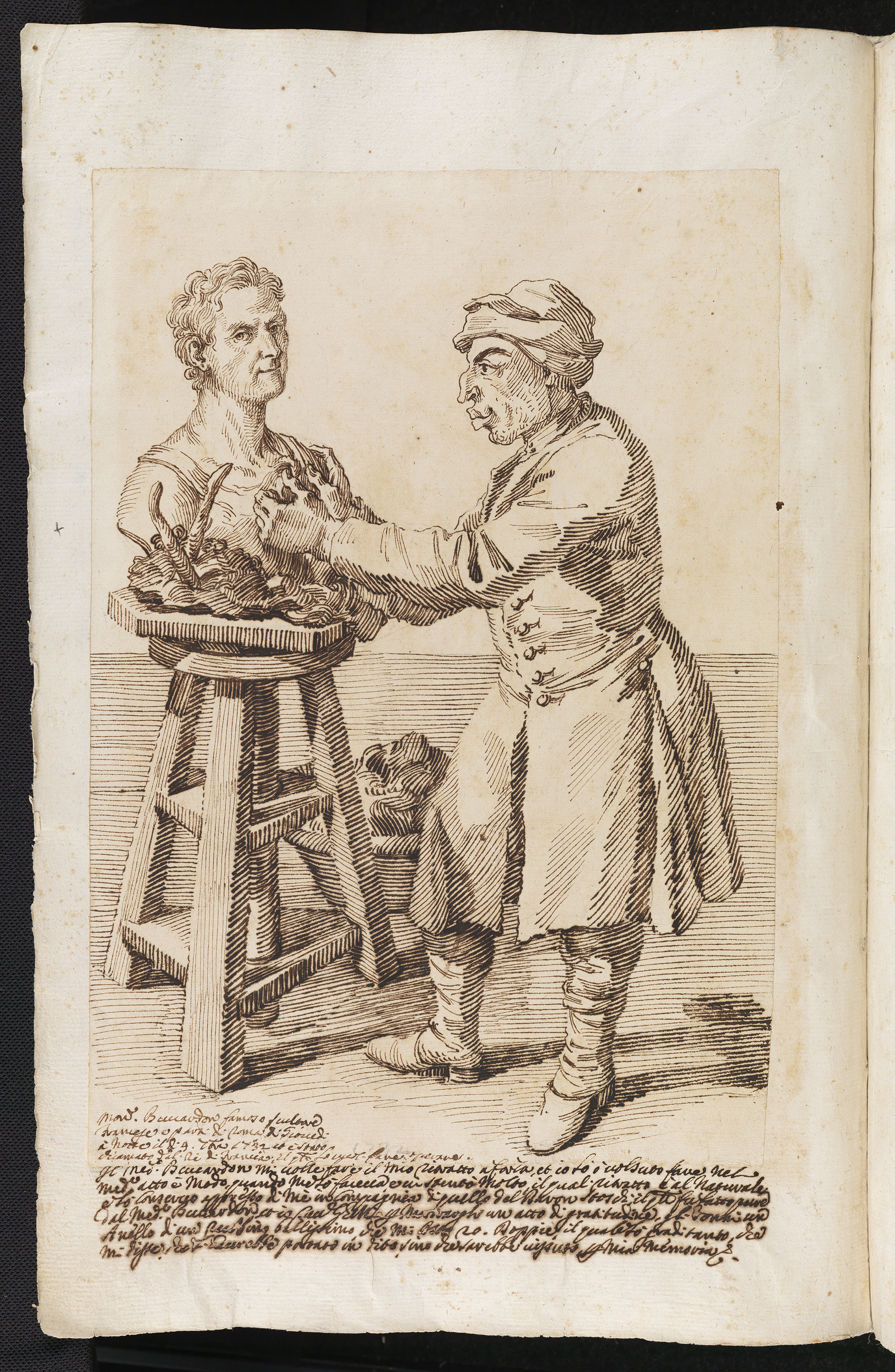 Pier Leone Ghezzi, Edme Bouchardon Modelling Pier Leone Ghezzi’s Bust, 1732. Pen and ink on paper. Vatican Library, Ott. Lat. 3116, fol. 89 verso. © 2021 Biblioteca Apostolica Vaticana