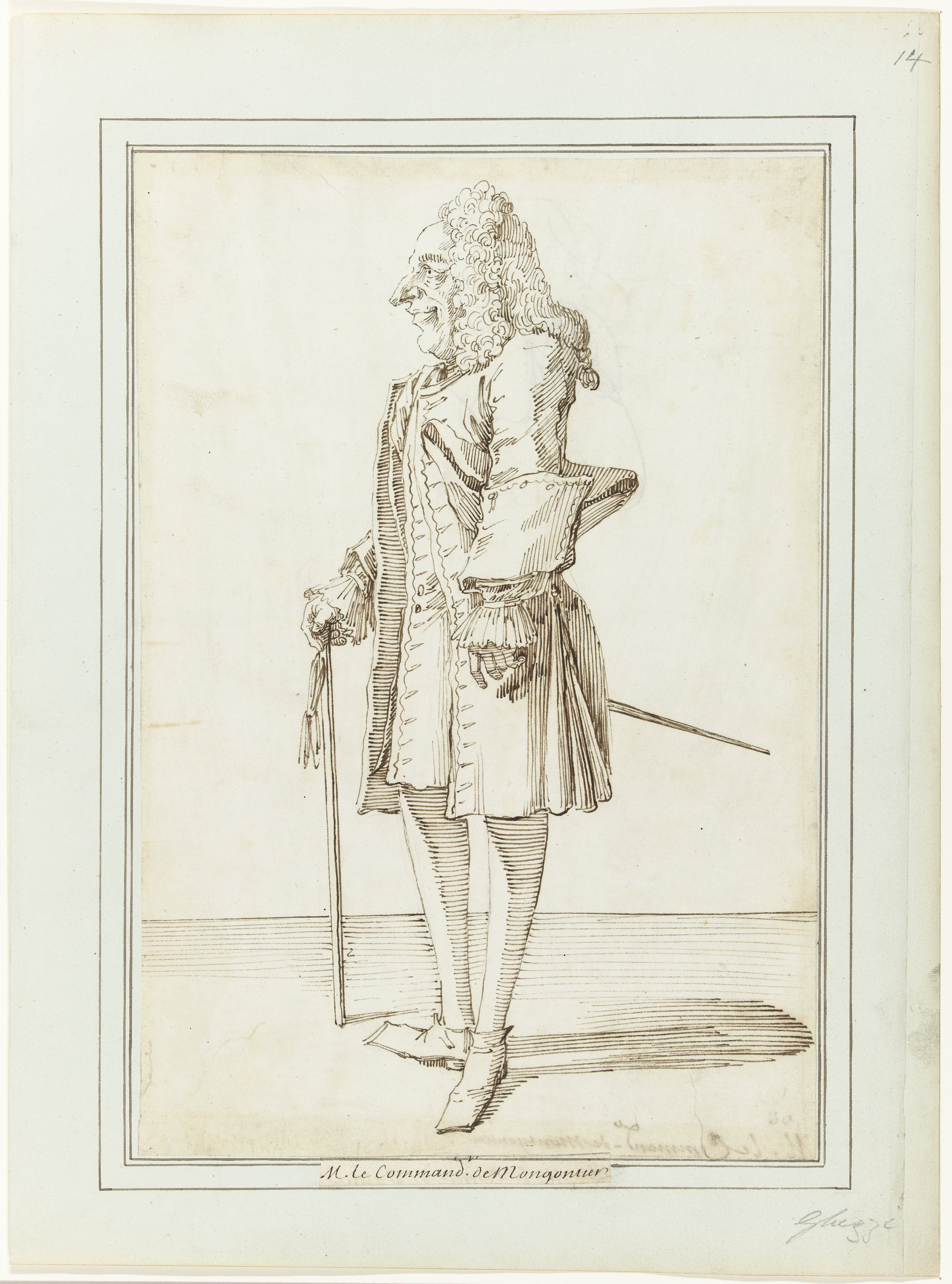 Perhaps due to the sheer number of drawings he executed, Ghezzi’s caricatures can sometimes appear formulaic. If the Chevalier de La Motte, for instance, is compared to Ghezzi’s portrait of another French military man (Fig. 2), the compositional similarities between the two become immediately apparent: feet positioned at the same angle, tricorn hat under the arm, and even comparable facial features. Indeed, Ghezzi consistently exaggerated only certain traits of his sitters’ physiognomy, such as their noses and mouths. As one critic noted, Ghezzi was “cruel to his sitters in endowing them rather uniformly with strange lips, peculiarly thick and beak-like. This seems to have been his favourite deformity.” 6 | JG