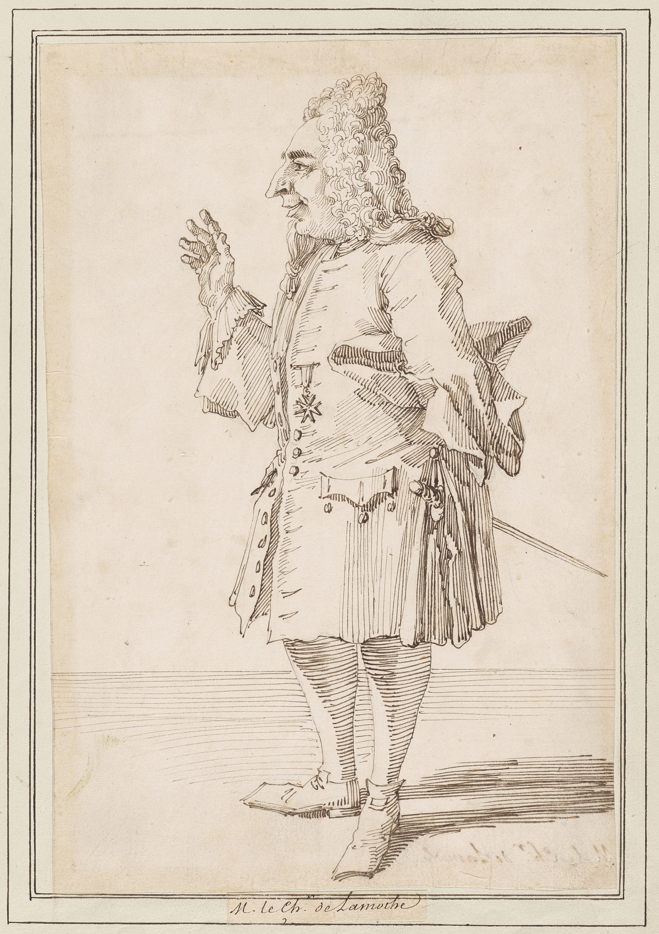Depicted in profile, a bewigged man in a military uniform holds a tricorn hat under his left arm and raises his large, knobby right hand in a gesture of greeting. The vertiginous slope of his forehead ends in a comically large pointed nose—its gaping, flared nostrils adding to the grotesque effect of his fleshy face. An old inscription on the verso of the drawing, later transcribed to the front of the mount, names the sitter as “M.[onsieur] le Ch.[evalier] deLamothe.”