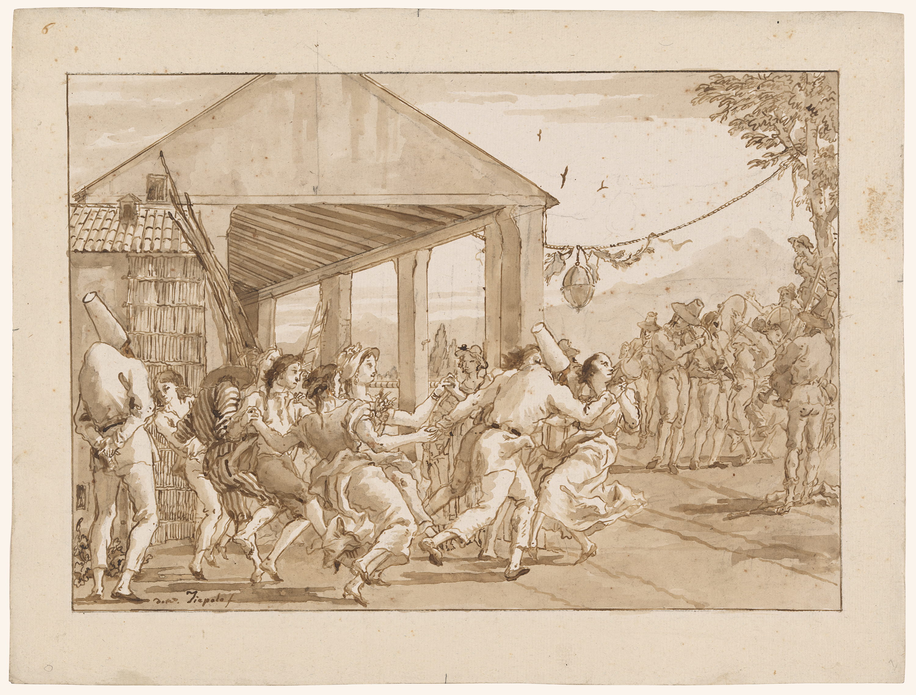 Lit by a setting sun that elongates their shadows, a crowd of men and women dance in front of a porticoed barn. On the right, a group of players with their instruments and a rope holding up a festoon and lantern mark this as a special occasion: a party. Using just pen, ink, and a brush over the faintest compositional outlines in chalk, Tiepolo divides the composition into three distinct tiers while still creating the impression of a unified, airy space. Displaying Tiepolo’s unparalleled command of wash, this drawing could be seen as a study of light and movement. Light dances across the surface of the sheet with the same energy as the boisterous merrymakers in the foreground. Country Dance is also a wonderful example of Tiepolo’s subtle humor (see cat. 14 ↙), as well as his very personal approach to drawing.