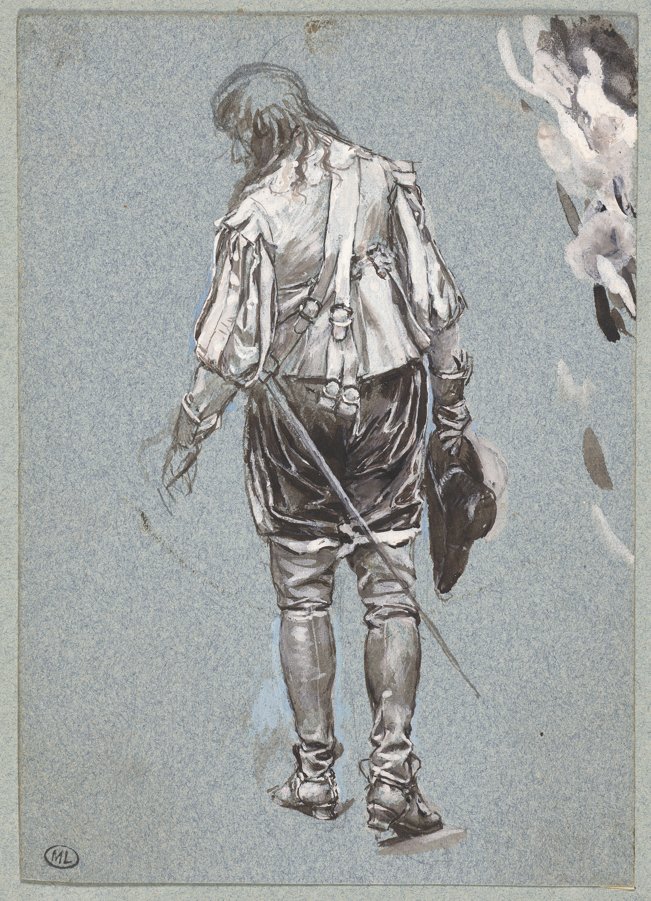 Ermets Meissonier, Young Officer Seen from Behind, Album Folio 33, ca. 1835–1890. Black pencil, brown ink, blue paper, heightened with white; 14.5 x 10.4 cm (5 3/4 x 4 inches). Musee d’Orsay, Paris, France, RF 2639, Recto. © RMN-Grand Palais / Art Resource, NY. Photo: TK