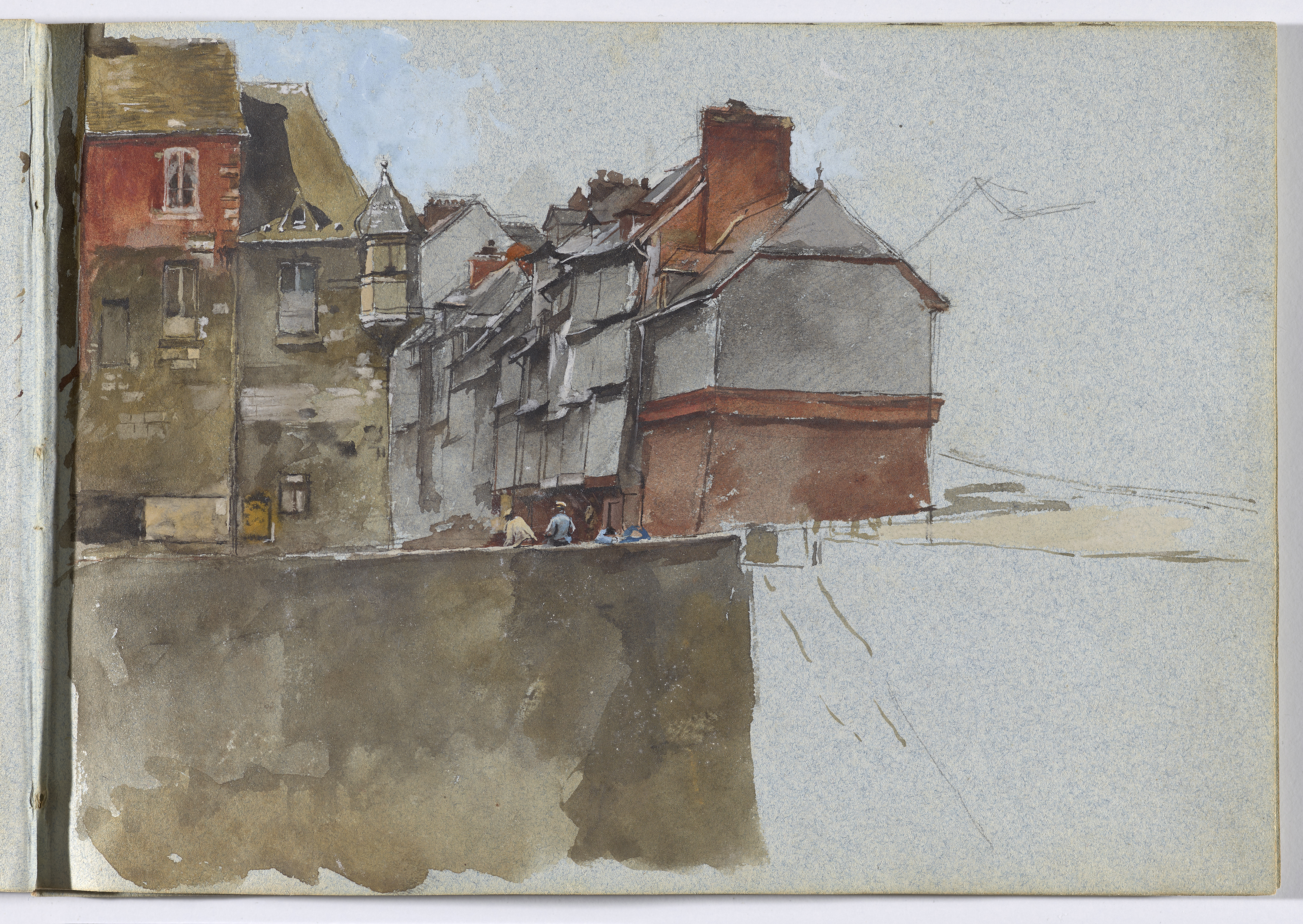 Jean Louis Ernest Meissonier, Page from a Sketchbook: View of a Town (Antibes?), facing page, ca. 1835 – 1890. Graphite, watercolor, and opaque watercolor on blue paper; 25.7 x 19.7 x 2.2 cm (10 1/8 x 7 11/16 x 7/8 inches). Jesse Metcalf Fund 80.238