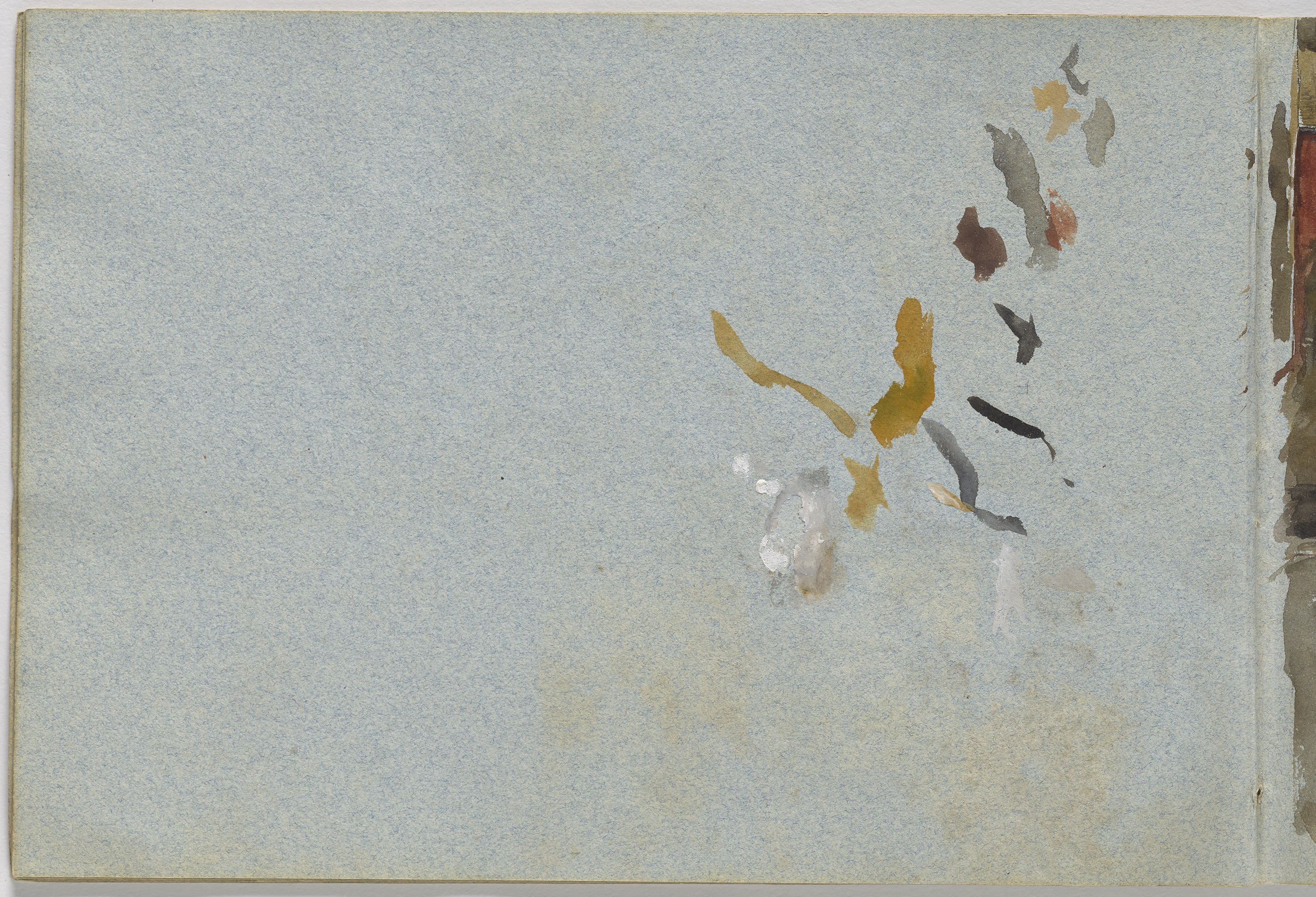 This luminous glimpse of a town was drawn on site in a sketchbook the artist carried during his travels. Capturing a momentary view, the rapid sketch is nonetheless rich in details of light and form, poetically encapsulating the brevity of a fugitive moment. In the intimate context of a private sketchbook, the viewer can follow as the artist transcribes his sensory impressions, beginning from the left-hand side of the sheet and gradually trailing off as he moves right. On the facing page, daubs of watercolor are the traces of the artist’s process, as he tested and calibrated his brush before applying it to his study (Fig. 1). Remarkable for its freshness and sense of immediacy, this partial view of a town is a wonderful example of Meissonier’s superior powers of observation.