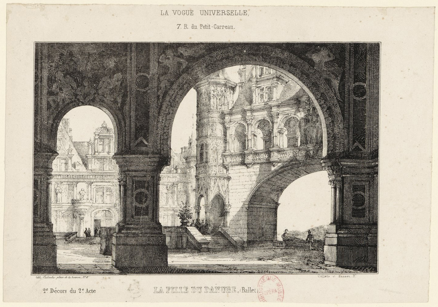 Engraving of an ornate building with a courtyard, seen from the perspective of a shaded corridor. Through two arches, one large and one small, we see the opposite side. Type above the image reads : La Vogue Universelle / 7. R. du Petit-Carreau. Type below the image reads: 2e Décors du 2e Acte / La Fille Du Danube. (Ballet)