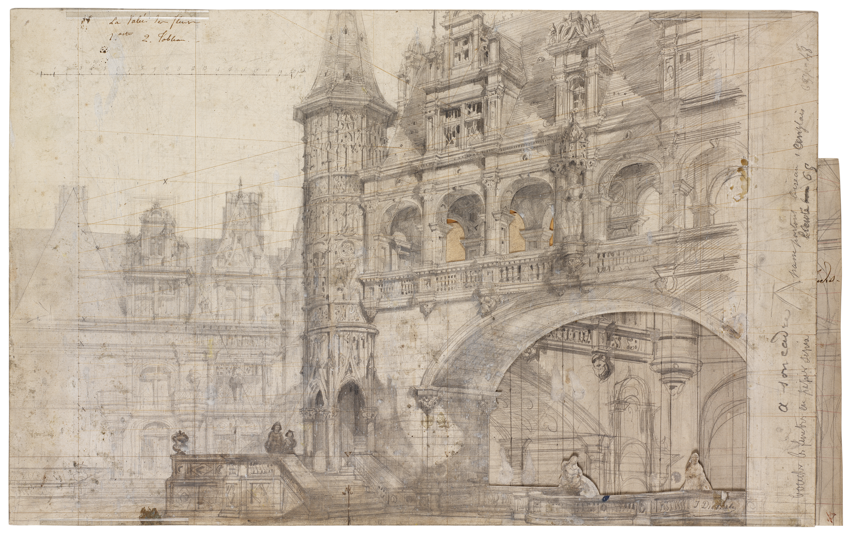 Diéterle, a partner in the theater-design firm Feucheres, Séchan, Despléchin & Diéterle, developed this architectural fantasy in graphite over a rigid grid of perspectival construction lines in ink that helped him create a convincing illusion of recession into space, a typical feature of scenographic designs for the theater. He also further explored the spatial depth of his composition by layering two sheets of paper. After carefully cutting out the opening under the large central arch and two smaller arched windows in the top sheet, he inserted a sheet underneath, on which he drew a perspectival view under the archway. It remains unclear whether Diéterle did this because he was unsatisfied with his first version or he wanted to try out a different solution. Intriguingly, a lithograph showing the realized set design (Fig. 1) reveals that the space under the central archway was left blank, and the entire palace was recessed further by adding two large round arches in the foreground, heightening the complexity of the perspectival view.2