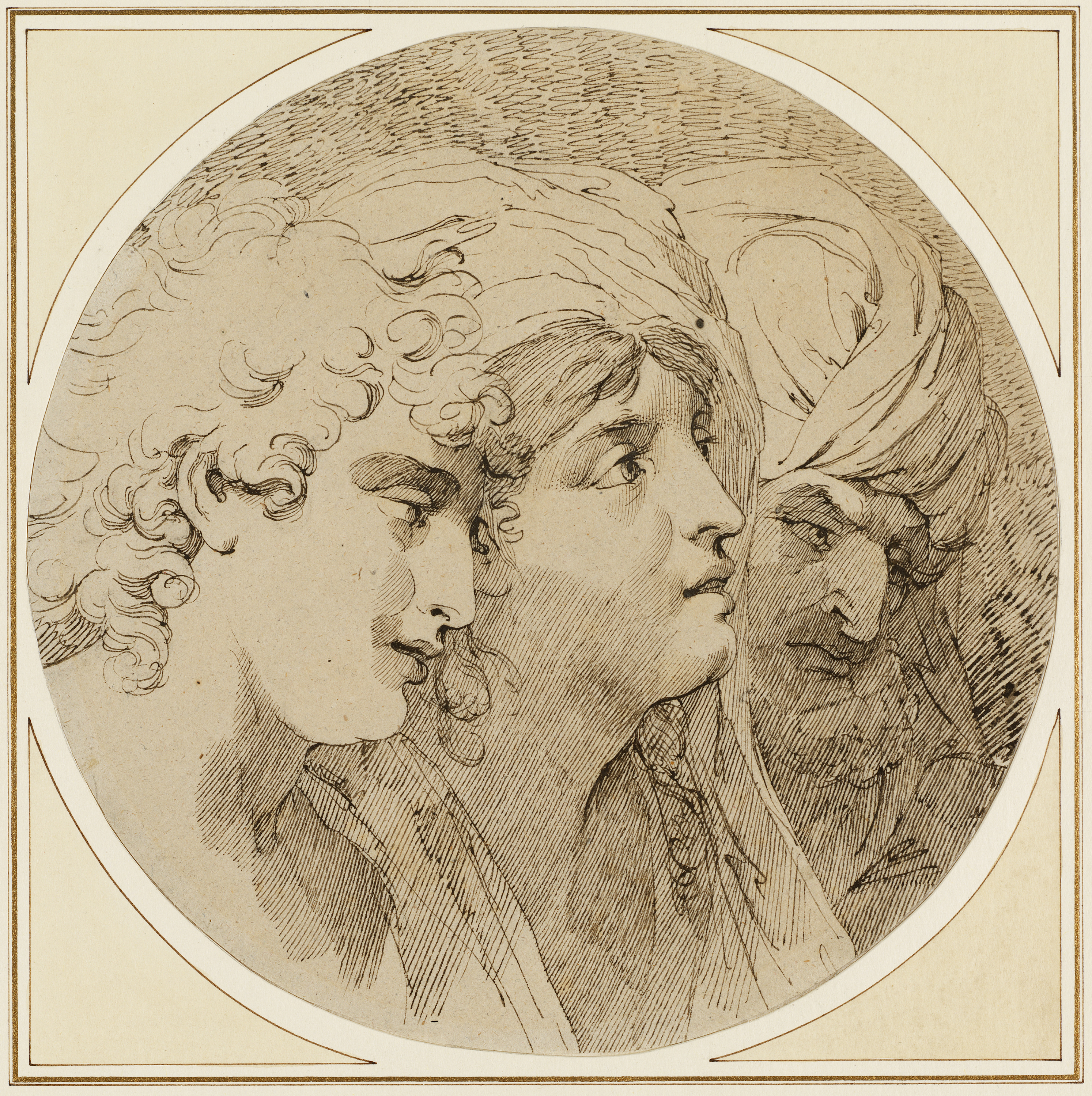 This drawing is one of many that Mortimer produced in the same circular format in the 1770s. The heads in these studies are always shown in profile, inviting us to compare them in ways that are indicative of the contemporary interest in physiognomy. This manifested itself in a variety of areas, from aesthetic theory to the natural sciences. Mortimer’s engagement with physiognomy flowed from his creative practice and passion for Italian art of the seventeenth century, especially the work of Guercino (see Cat. 39 ↙) and Salvator Rosa, which Mortimer knew through printed reproductions. These prints focused largely on their figure and head studies and included exoticized depictions of Oriental types such as appear in this drawing. In the eighteenth century, collections of these prints were often issued as model books for students of drawing.