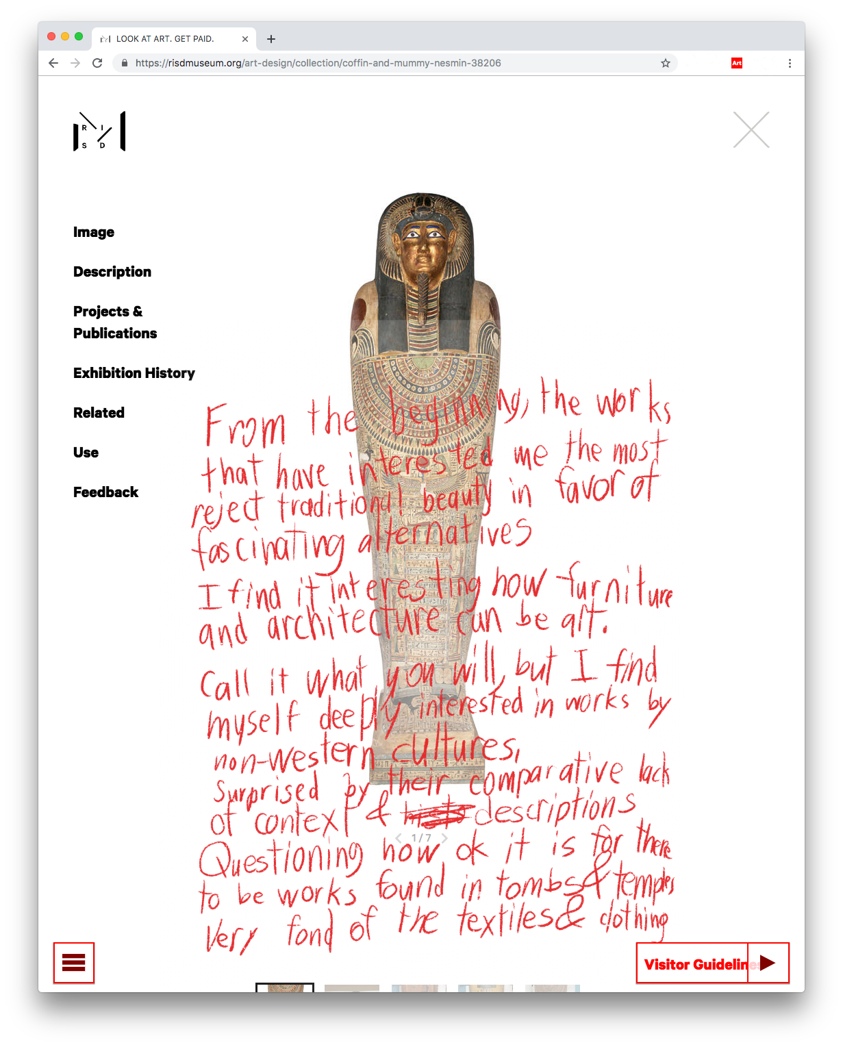 A screenshot from risdmuseum.org/edit shows the museum’s entry for the mummy of Nesmin with a critic’s handwritten note overlayed. The full quote reads: From the beginning the works that have interested me the most reject traditional beauty in favor of fascinating alternatives[.] I find it interesting how furniture and architecture can be art. Call it what you will, but I find myself deeply interested in works by non-western cultures[.] Surprised by their comparative lack of context & descriptions[.] Questioning how ok it is for there to be works found in tombs & temples. Very fond of the textiles & clothing.