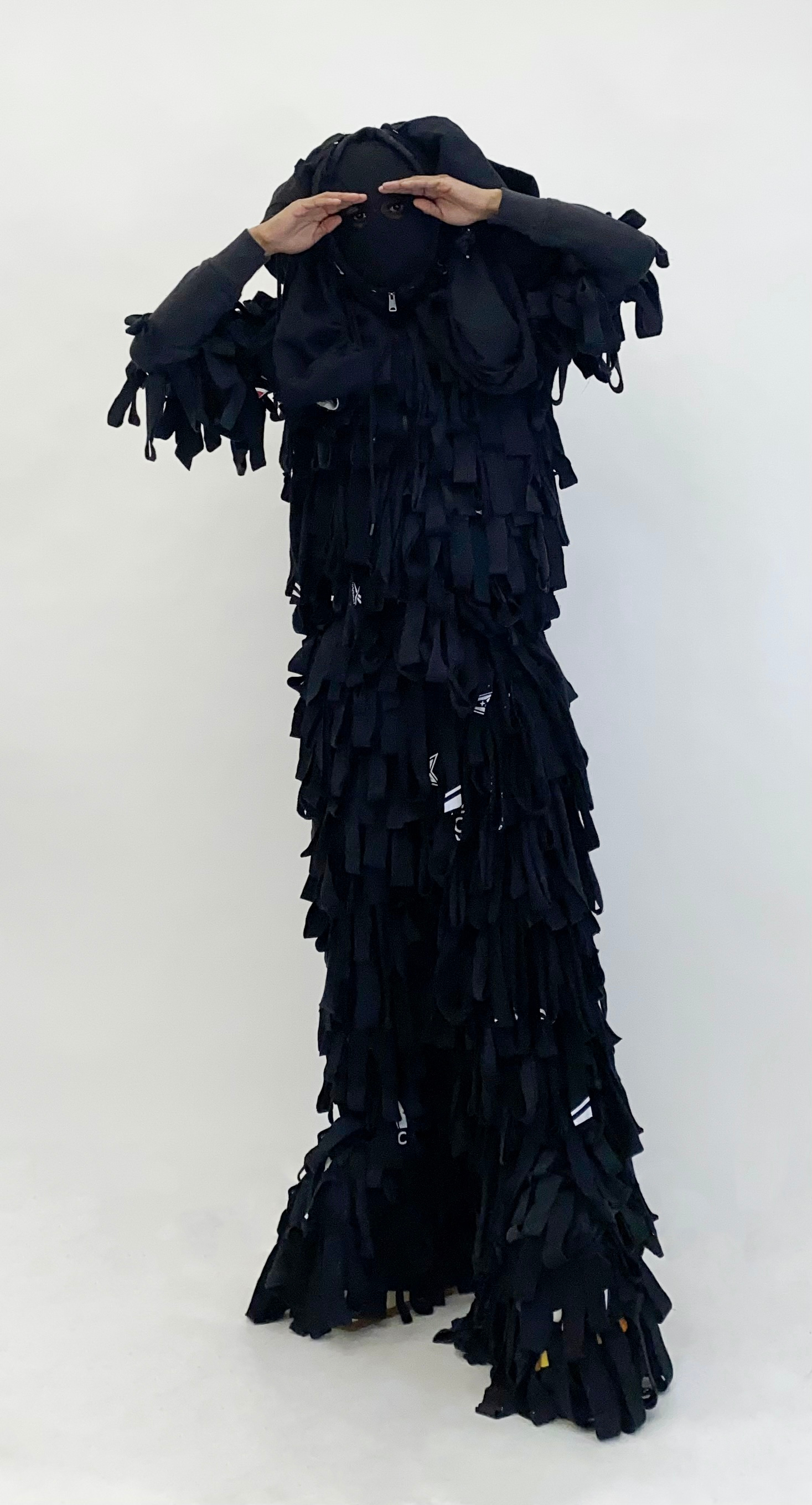 In this performance, artist Khalil McKnight (RISD BFA 2027, Painting) wears a garment made from repurposed black hoodies inspired by Egungun and New Orleans Masquerade culture. Silently walking galleries in the role of a visitor while making written assessments of the historical paintings on view, The Observer critically examines institutional access and the relationship of Black and Brown bodies to museum spaces.