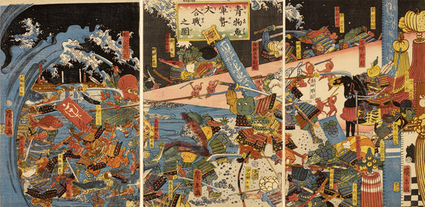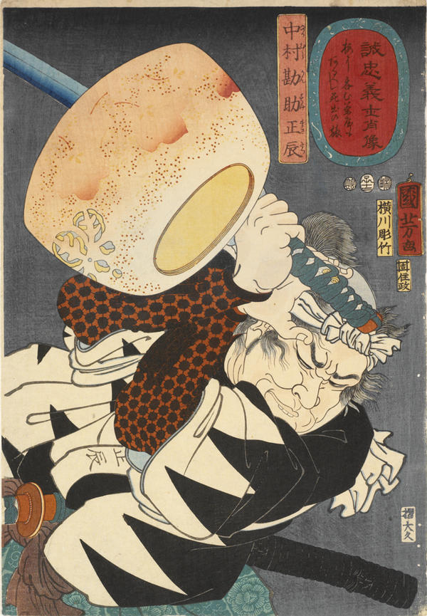 The historical narratives and tales of heroes or ghosts are the subject of this exhibition. The marked increase in violent and supernatural subject matter in the arts of nineteenth-century Japan may be attributed in part to increasing social unrest as the Tokugawa shogunate (1615-1868) entered its final stages of decline. On the Kabuki stage, plays about revenge and retribution became increasibly popular. In the Treasury of Loyalty (Chushingura), a story first recounted in puppet theater, forty-seven measterless samurai (ronin) take revenge on Lord Kira of Kosuke for the death of their master, Lord Asano Nagonori (1667-1701). Lord Kira has provoked Lord Asano to draw his sword in the palace, an offense that required Asano to commit ritual suicide. The samurai, whose revenge on the snowy night of January 3, 1703, was dictated by loyalty to their dead lord, violated the law in killing Lord Kira. Despite public admiration for their act, they were eventually ordered by the government to commit ritual suicide themselves.
