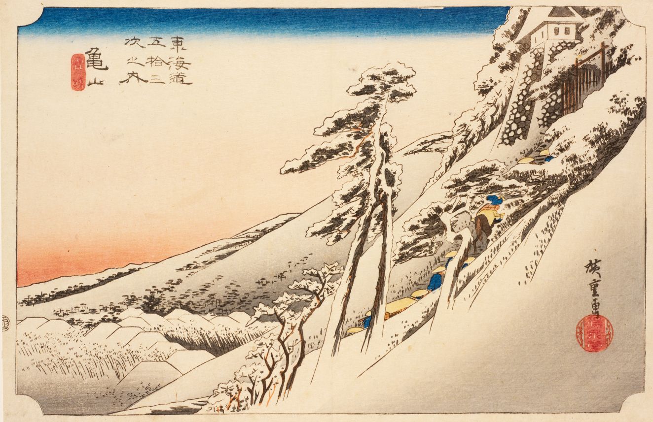 Renowned for his sensitive and faithful renderings of the Japanese landscape, Utagawa Hiroshige is perhaps best known for his series The Fifty-Three Stations of the Tokaido (1833-1834), which was wildly successful in Japan and in Europe. Its popularity inspired the artist to create more than 20 other series depicting activity along the Tokaido Road. As the main travel and transport artery, the Tokaido connected the military capital, Edo (Tokyo), with the imperial capital, Kyoto. The road had 53 post stations where travelers could rest and replenish supplies.
