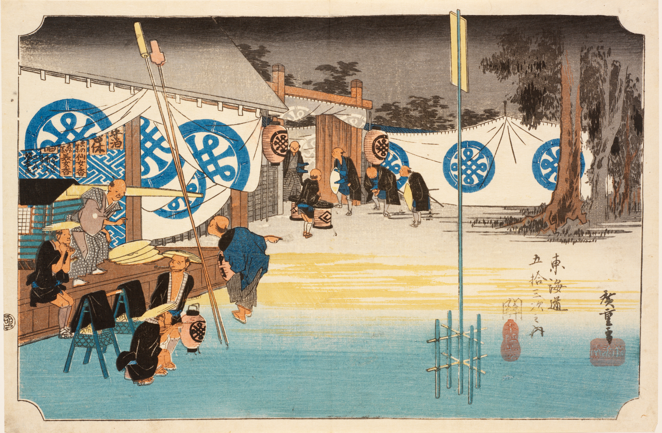 Renowned for his sensitive and faithful renderings of the Japanese landscape, Utagawa Hiroshige is perhaps best known for his series The Fifty-Three Stations of the Tokaido (1833-1834), which was wildly successful in Japan and in Europe. Its popularity inspired the artist to create more than 20 other series depicting activity along the Tokaido Road. As the main travel and transport artery, the Tokaido connected the military capital, Edo (Tokyo), with the imperial capital, Kyoto. The road had 53 post stations where travelers could rest and replenish supplies.