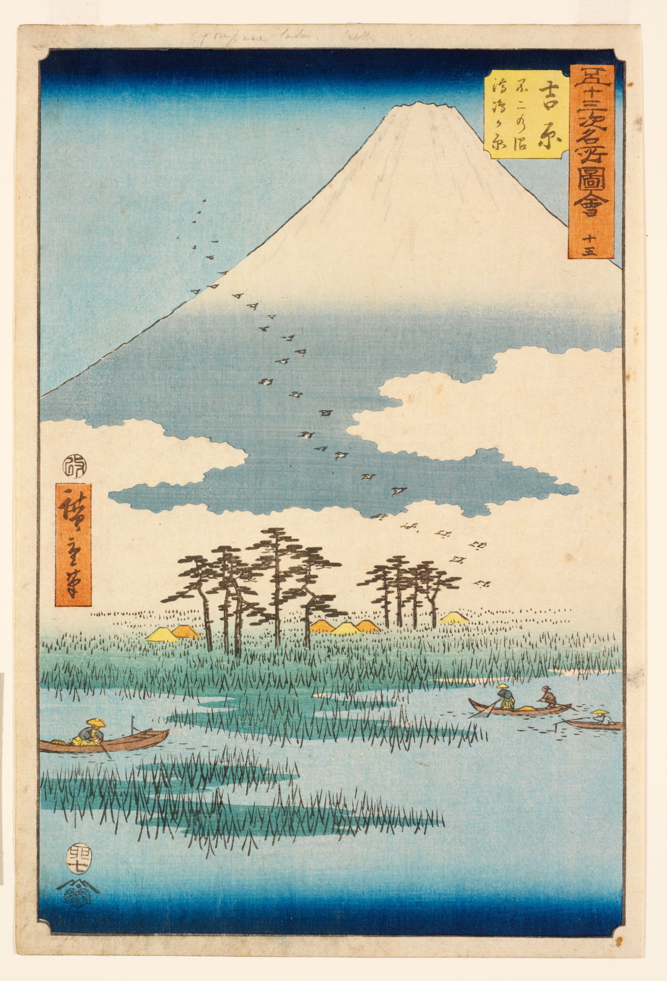 The paired prints in this exhibition show seven stations from the artist’s first and last series depicting the Tokaido Road. The first, The Fifty-Three Stations of the Tokaido, also known as the Hoeido Tokaido after the publishing house that printed the series, was completed in 1834. In 1855, Hiroshige completed the last set, Pictures of Famous Places of the Fifty-Three Stations of the Tokaido. This group is also referred to as the Tate-e Tokaido, or the Vertical Tokaido. The shifts in style between the first and last series are evident: in the Hoeido Tokaido, Hiroshige focuses on travelers and their interaction with the landscape, while in the Tate-e Tokaido, the artist presents majestic landscape views in which figures play a secondary role. These differences perhaps reflect the artist’s changing perspective as he aged.