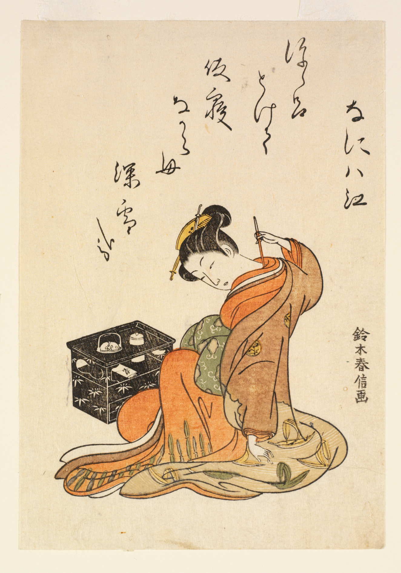 This exhibition includes a variety of printed materials, both in book form and as single sheets from books. Early 18th-century prints illustrate how text and image might be combined, as in Shunsho's depiction of episode two of the Tales of Ise on this wall. By contrast, in the Harunobu pages to the left of that print, poetic texts have been incorporated into the overall design of the page/sheet. Other prints are drawn from artists' books (gafu) that transmit compositions associated with particular painters or schools of painting; from deluxe albums of prints; and from botanical works. The examples in the cases assume two different formats: the folding book (orihon) and the book with sewn binding (fukurotoji, or "thread-sewn bag binding"). Book publication was an integral part of the very significant evolution of woodblock printing in Edo-period Japan. This selection of works from the Museum's collection is only a small indication of the printing culture that thrived during this era and continues even today in contemporary Japan.
