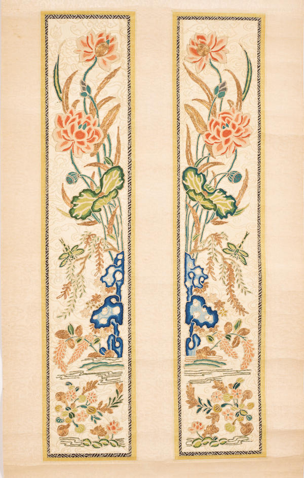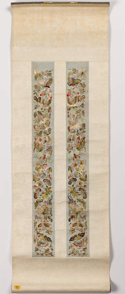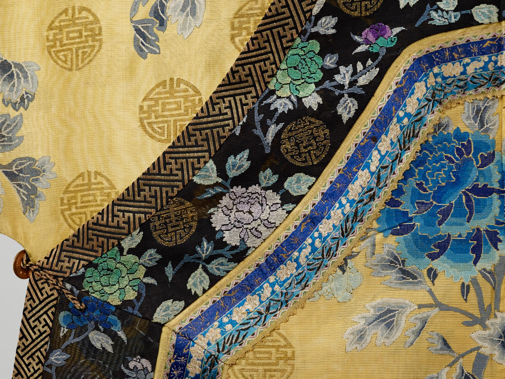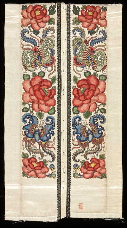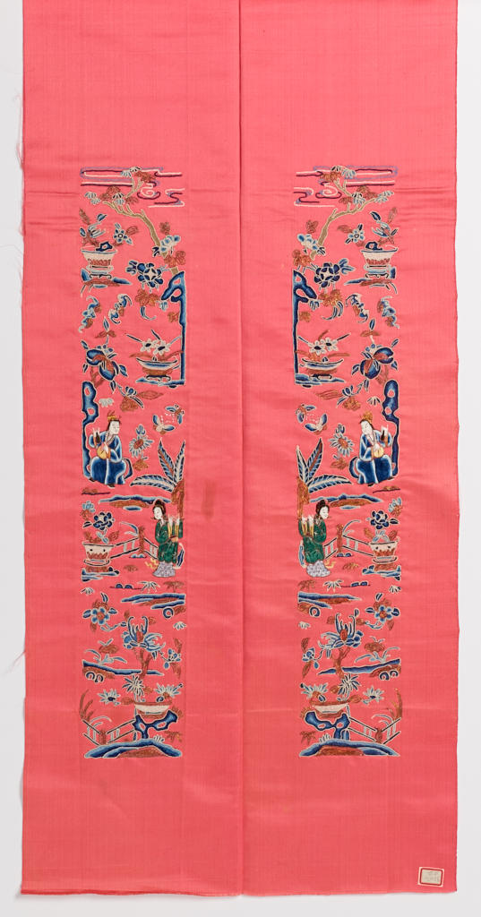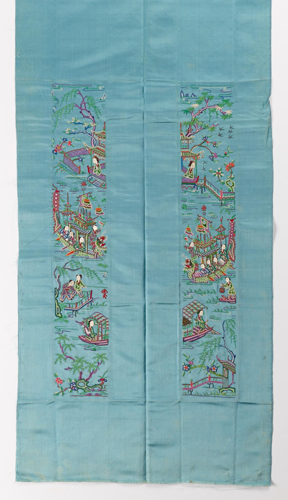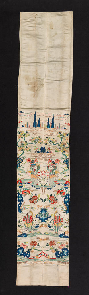 The embellished cuffs of Chinese robes are known as sleeve bands (huan xiu). The faces of the bands appear relatively simple and void of decoration, however when worn the oversized fit in the length of the sleeves drape to the front of the arm, revealing a highly embellished reverse. The aesthetic field of the sleeve band offered artisans the opportunity present narrative scenes such as figures and landscapes that often did not find place in other Chinese garments. The most common decorative elements are botanical, insect, and “eight-treasure” symbols. Satin woven silk is the most common ground for sleeve bands, however gauze weaves, both figured and plain, were also popular and represented in this exhibition.