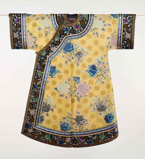 The silk bands were produced independently of the robes themselves. As the bands were created autonomously of the robes many examples were never attached to a garment and have survived in pristine condition. Most examples in the Aldrich collection are prepared as bands while others are mounted on paper scrolls. Some that Aldrich collected are process examples of sleeve bands that have yet to be cut from the full textile lengths that they were worked on. Aldrich also collected related brocaded ribbons that decorated successive courses on the sleeves. Of special note in this exhibition is an example from the Museum collection that is still wrapped on its original packaging (55.243) listing a Canton address for Yu Kee Co.. From ca. 1850 on the primary manufacturing sites for silk textiles in China were Suchou, Shanghai, and Canton -- in particular these sites focused on machine-woven ribbon trims. The sleeve bands and ribbons on display all date from the Tongzhi reign-period (1862-1874) and Guangxu reign-period (1875-1908).