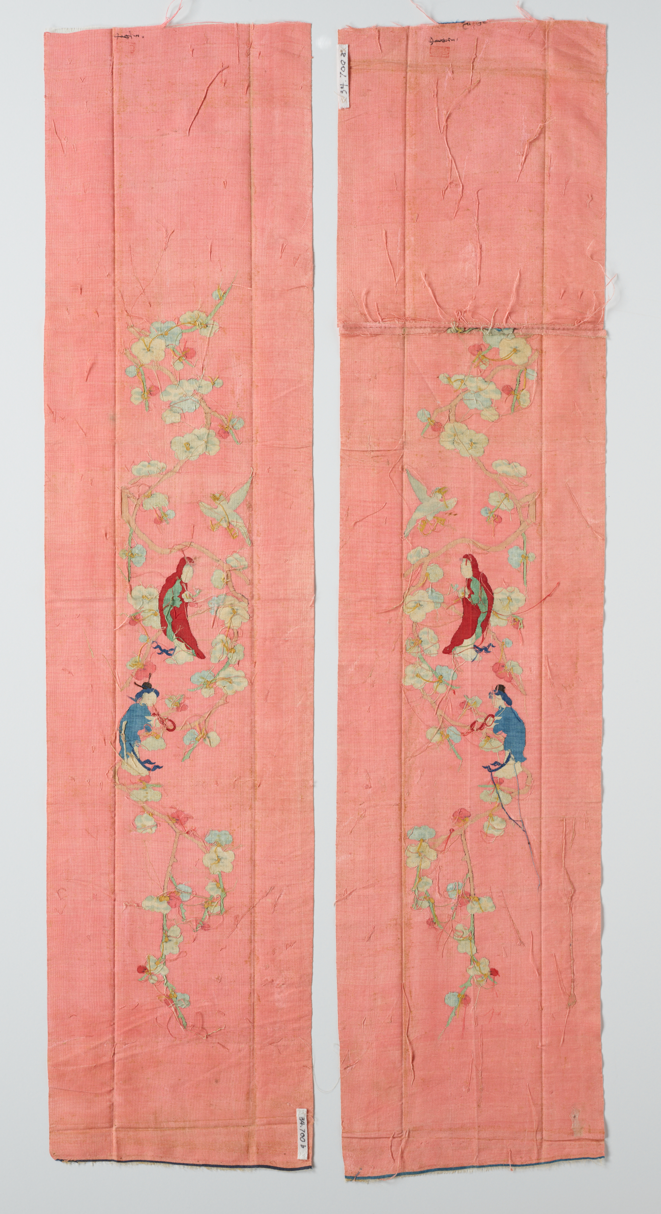 The embellished cuffs of Chinese robes are known as sleeve bands (huan xiu). The faces of the bands appear relatively simple and void of decoration, however when worn the oversized fit in the length of the sleeves drape to the front of the arm, revealing a highly embellished reverse. The aesthetic field of the sleeve band offered artisans the opportunity present narrative scenes such as figures and landscapes that often did not find place in other Chinese garments. The most common decorative elements are botanical, insect, and “eight-treasure” symbols. Satin woven silk is the most common ground for sleeve bands, however gauze weaves, both figured and plain, were also popular and represented in this exhibition.
