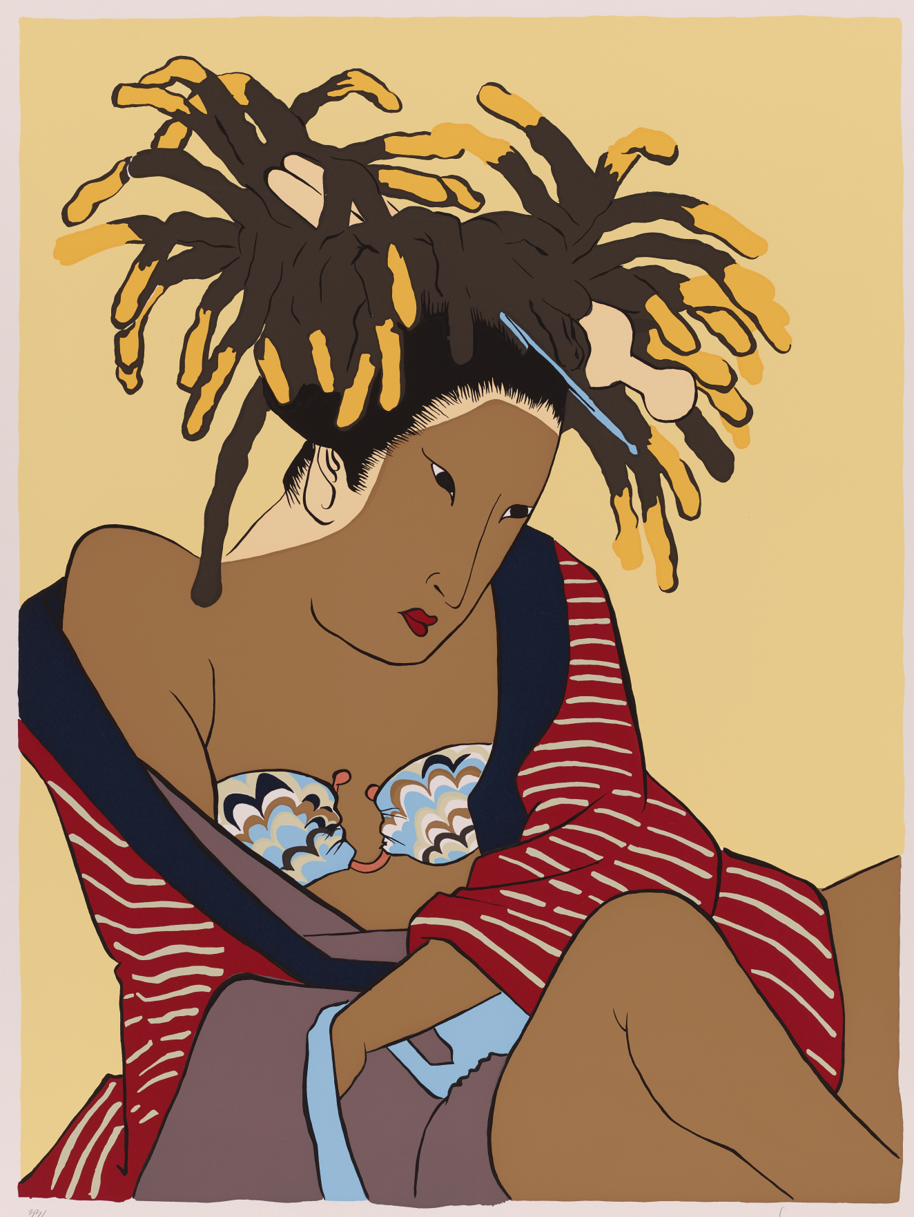 Iona Rozeal Brown and Kara Walker use stylized representations of the figure to comment on social issues. Brown draws upon the tradition of late-18th-century Japanese woodblock prints to portray the contemporary phenomenon of ganguro - Japanese youths who mimic hip-hop audio artists by darkening their skin and coiling their hair into dreadlocks. Like Brown, Walker appropriates an historical genre to depict her characters. Using the familiar 19th-century silhouette, she relates explosive visual narratives that reveal unspoken truths of racial and sexual taboos. By embedding charged imagery within the polite tradition of the silhouette, she greatly enhances the potent and seductive power of her art.