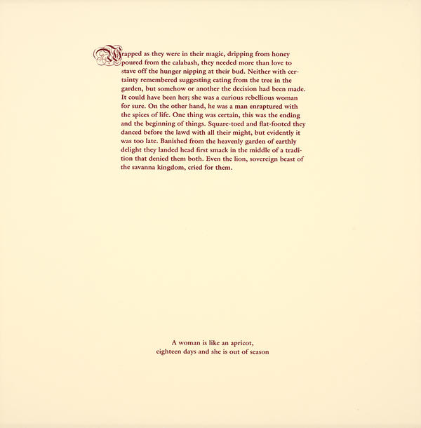 Alison Saar, Lorna Simpson, Joyce Scott, and Ana Mendieta work with generalized representations to speak to historical and cultural concerns. Saar’s striking woodcut Ulysses appropriates a classic Greek myth to transpose the theme of resistance and perseverance into an African-American context. Her powerful clothed male figure, hanging from his feet, conjures images of lynching and defenselessness, yet his calm composure defies his situation and his oppressors. Lorna Simpson’s photographic print Counting gives the viewer quite limited information - a Black woman seen from behind, a smoke house and slave quarter, and a coil of braids along with numerical references to time and counting - that nonetheless conjures the plight of African Americans past and present. Critics have noted that Simpson’s coded visual language is consistent with the tradition of African-American musical forms, among them spirituals and blues. Joyce Scott’s dazzling and mysterious beaded sculpture Spirit Siamese Twins mixes references to many cultures as she literally threads symbolic imagery into her female figure. The twins in the piece are Mexican wooden skeletons used in Day of the Dead celebrations, but the reference garners rich meaning from contexts for double births embedded within all cultures. The skeleton, a common image in her work, appears again the monoprint, wherein she addresses the vulnerability of children. Ana Mendieta, too, borrows freely from many cultures. An influential performance and earthwork artist, she created Furrows in 1984 during an artist residency at RISD. Formerly installed in the space where the Museum’s Farago Wing now stands, Furrows outlined the shape of an earth goddess in one ton of sod. Drawing inspiration from ancient cultures that she believed to possess knowledge of and respect for nature, her work points to the association of the female gender with the fecund earth.